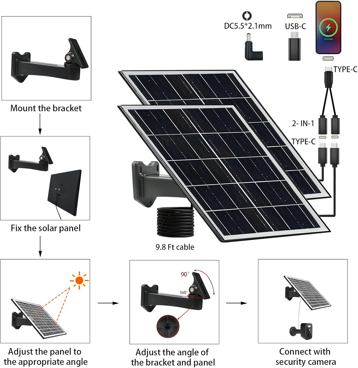 【IP65 WATERPROOF】This outdoor security camera solar panel is IP65 waterproof, which can completely prevent sand and dust from entering,suitable for outdoor installation.The 360 ° adjustable bracket ensure the angel of maximal sunlight exposure. The 9.8ft charging cable is paired with the original USB C interface for easy connection to charging devices. We provide the silicone waterproof ring,effectively solving the problem of water leakage at the interface