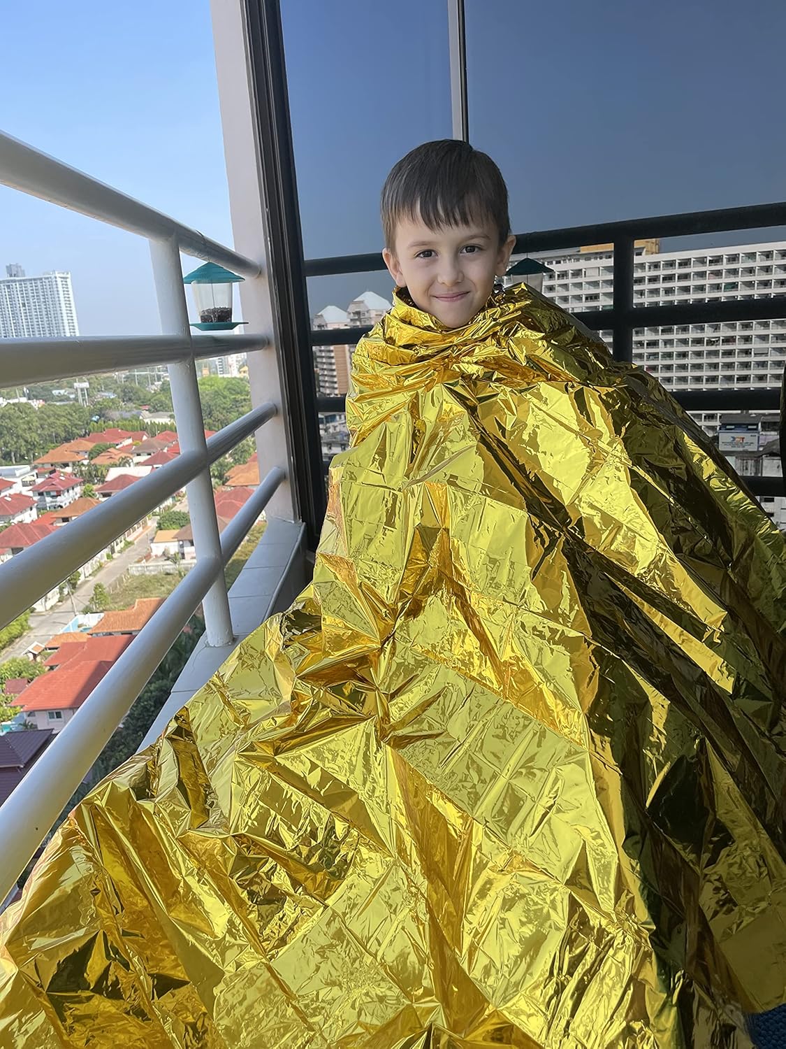A thermal blanket is a must in every home, car and even in a backpack while traveling or outdoor activities. Our emergency blanket is made with Mylar material. Mylar has insulating properties and can reflect/retain 90% of human body heat. It is also weatherproof and will keep you warm under any circumstances.