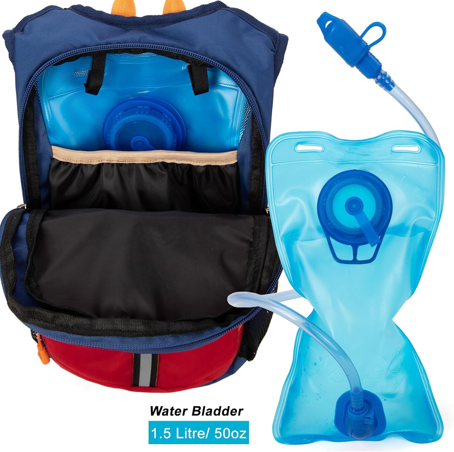 Made of water resistant polyester fabricBright colors and mini size, specially designed for your children hiking outdoorComfortable to wear for a long time walking or bikingThe backpack dimension: 14.0 inch x 7.4 inch x 3.5 inch. Capacity: 5L1.5L water bladder reservoir provides enough water needs for your toddlers/ kids/ boys/ girls The reflective strip and the safety whistle will give your kids more safety on the trailAdditional D-buckle can be used to hang your kid’s favorite keychain or sunglasses