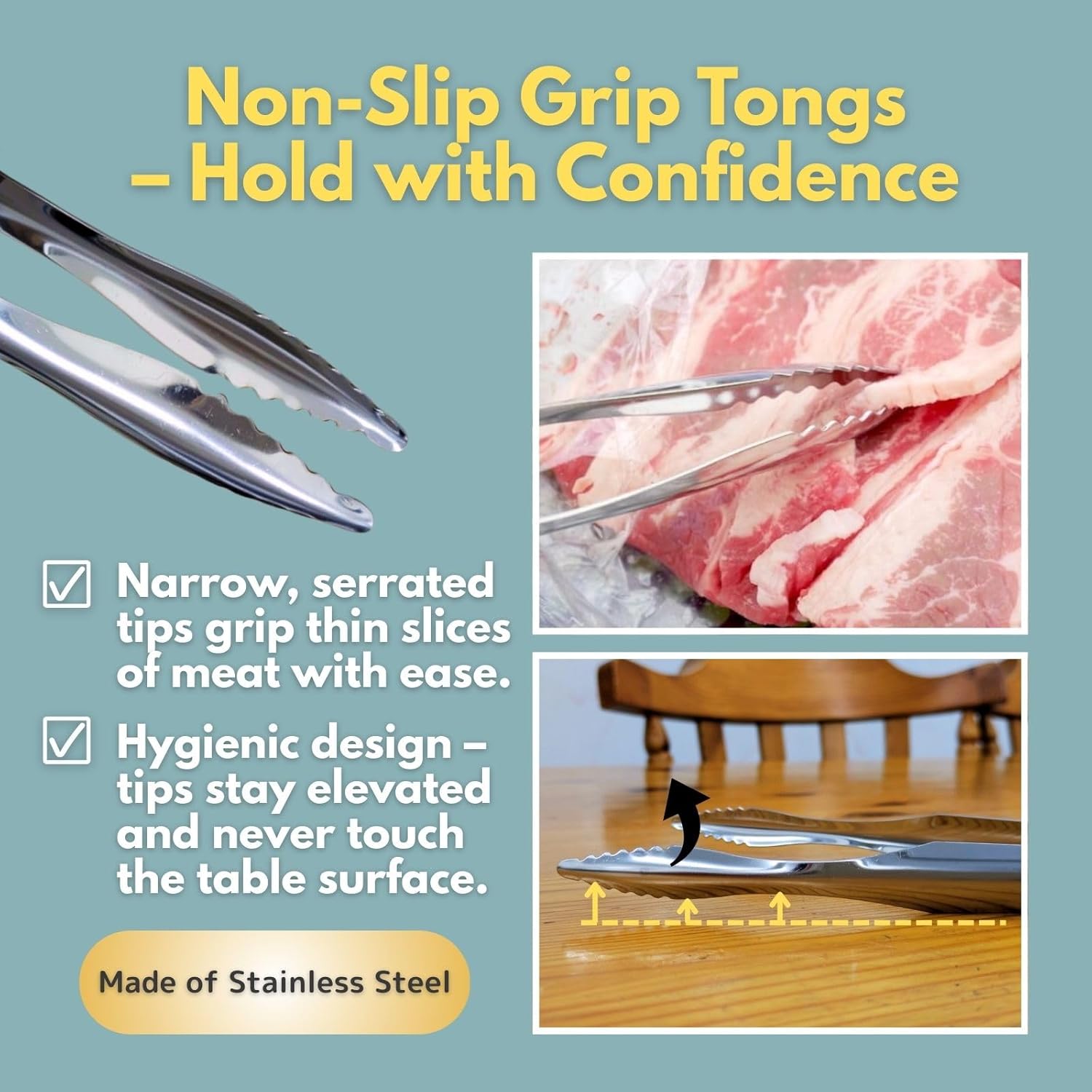 Stainless Steel Tongs:Serrated narrow tips for gripping thin meat easily Hygienic design: tips stay elevated off surfaces. Material: Stainless steel Size: 23.5 cm / 9.25 inches