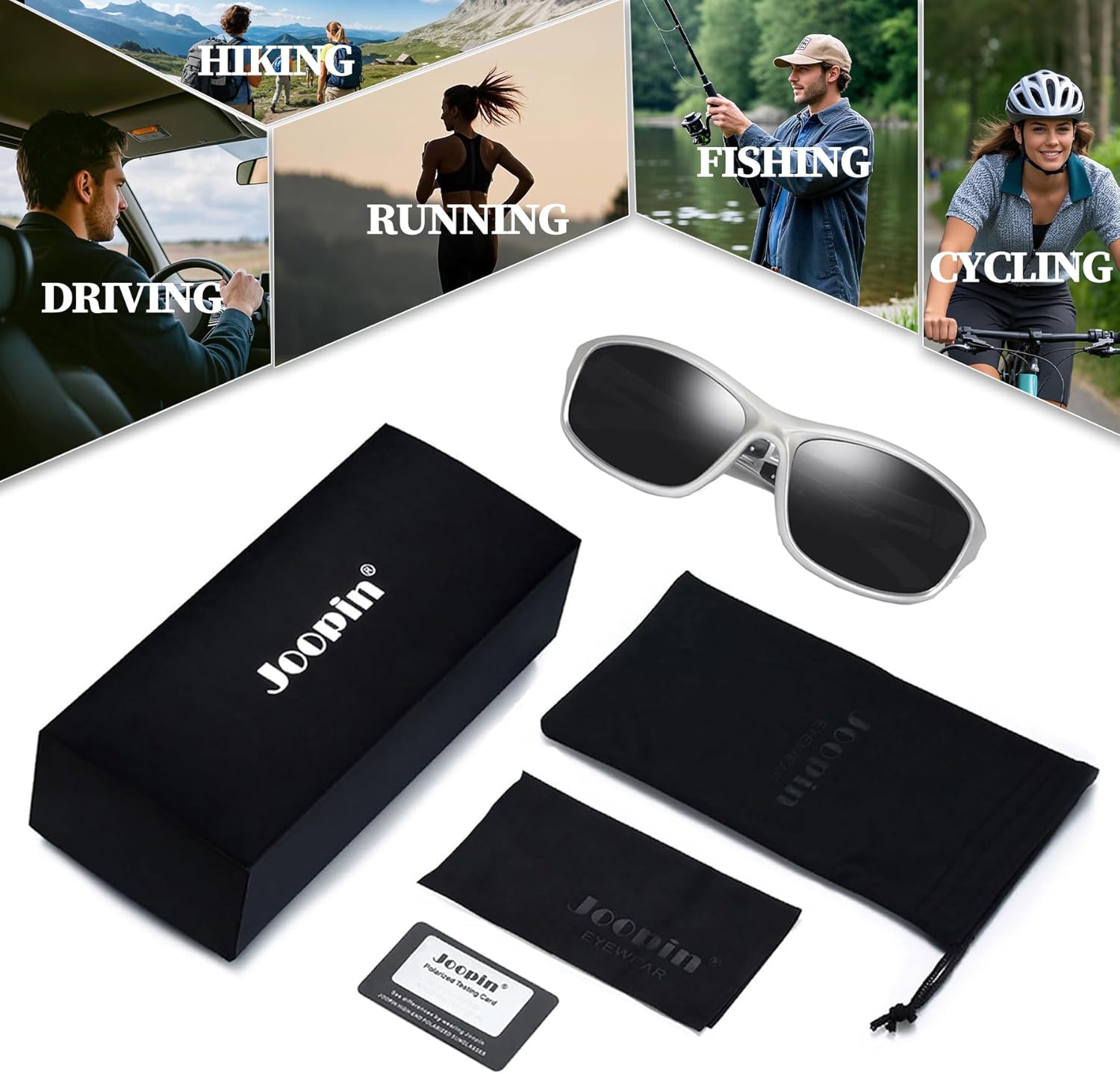EXQUISITE BOX PACKAGED: Sliver dark sunglasses x1 / soft box x1 /exquisite bag x1 / lens cloth x1 / polarized testing card x1. Packaged already, making it a wonderful yet practical festival idea for friends and family, special for the dad sunglasses! Show your true color and reach your peck with silver sports glasses. Stay cool with dark shades for men women. Joopin focuses on fashion womens sunglasses and mens sunglasses. Click and get your quality and cheap sunglasses now