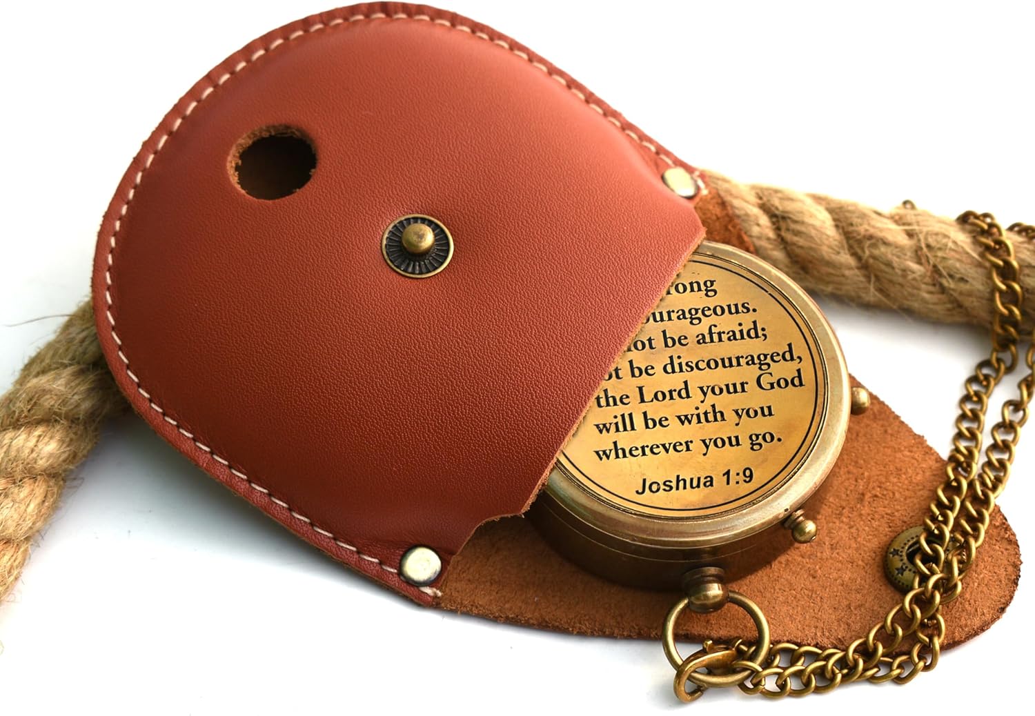 Be Strong and Courageous (Joshua 1:9) Brass Compass with wooden Box-Engraved Scripture Prayer Compass Religious Gift for Men & Women – Baptism, Confirmation, Communion Compass for Boys Graduation Gift