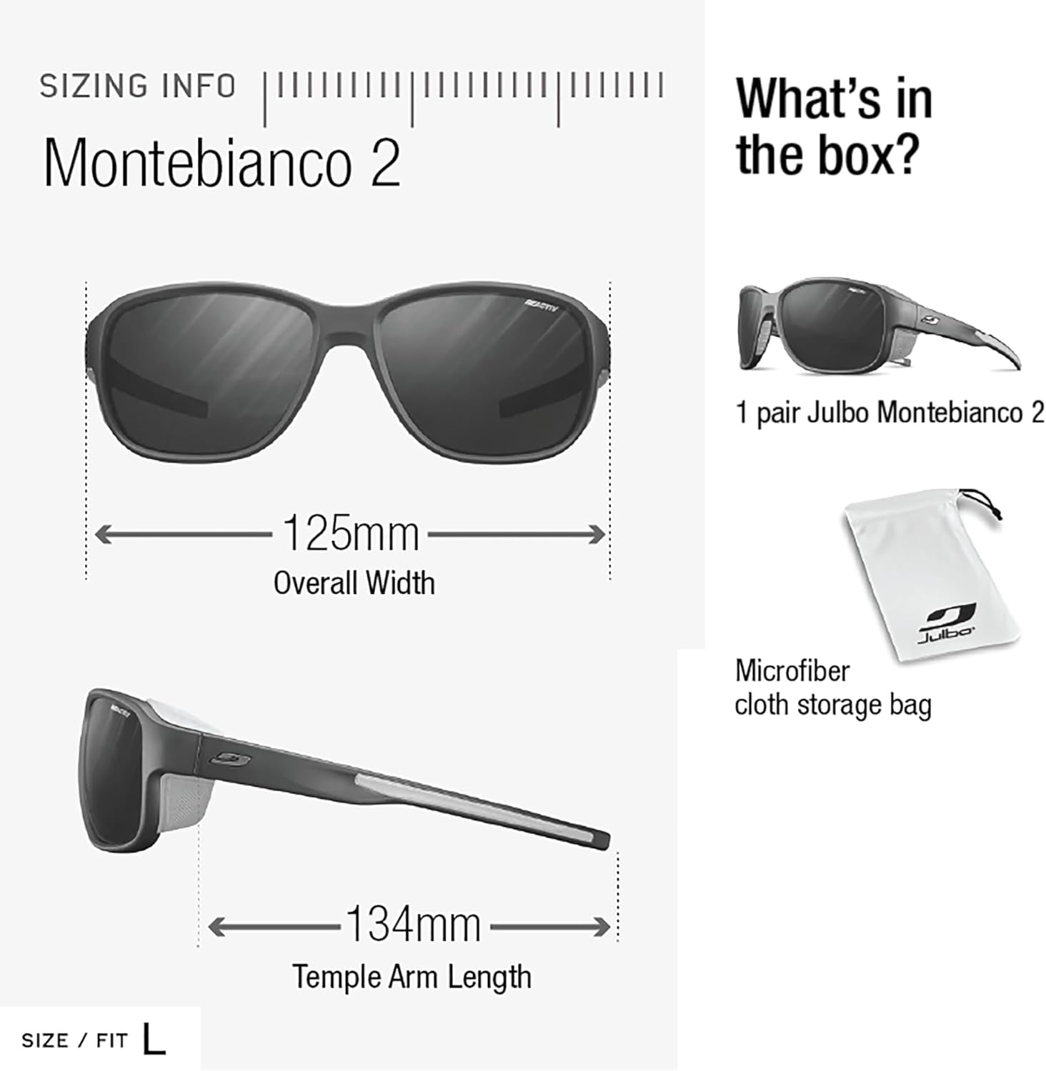 INTENDED USE: The Julbo Montebianco 2 sunglasses are designed for mountaineering, hiking, and climbing, offering protective features and removable side shields for high-glare conditions like those found at altitude.