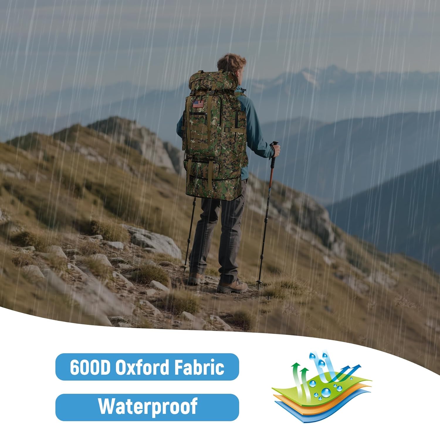 【Hiking Backpack Structure】: The main bag of the 100L camping backpack adopts a high-strength drawstring closure design, making it easy to store camping equipment such as tents, sleeping bags, and clothing. There is 1 main bag, 2 front zipper bags, 2 side bags (perfect for water bottles or tools), and 1 top bag with a hidden rain cover compartment, which can be stored separately and orderly.