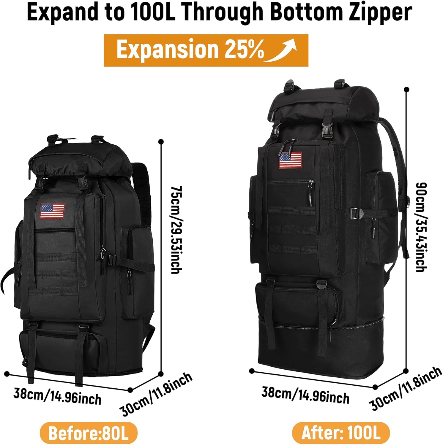 【Hiking Backpack Structure】: The main bag of the 100L camping backpack adopts a high-strength drawstring closure design, making it easy to store camping equipment such as tents, sleeping bags, and clothing. There is 1 main bag, 2 front zipper bags, 2 side bags (perfect for water bottles or tools), and 1 top bag with a hidden rain cover compartment, which can be stored separately and orderly.