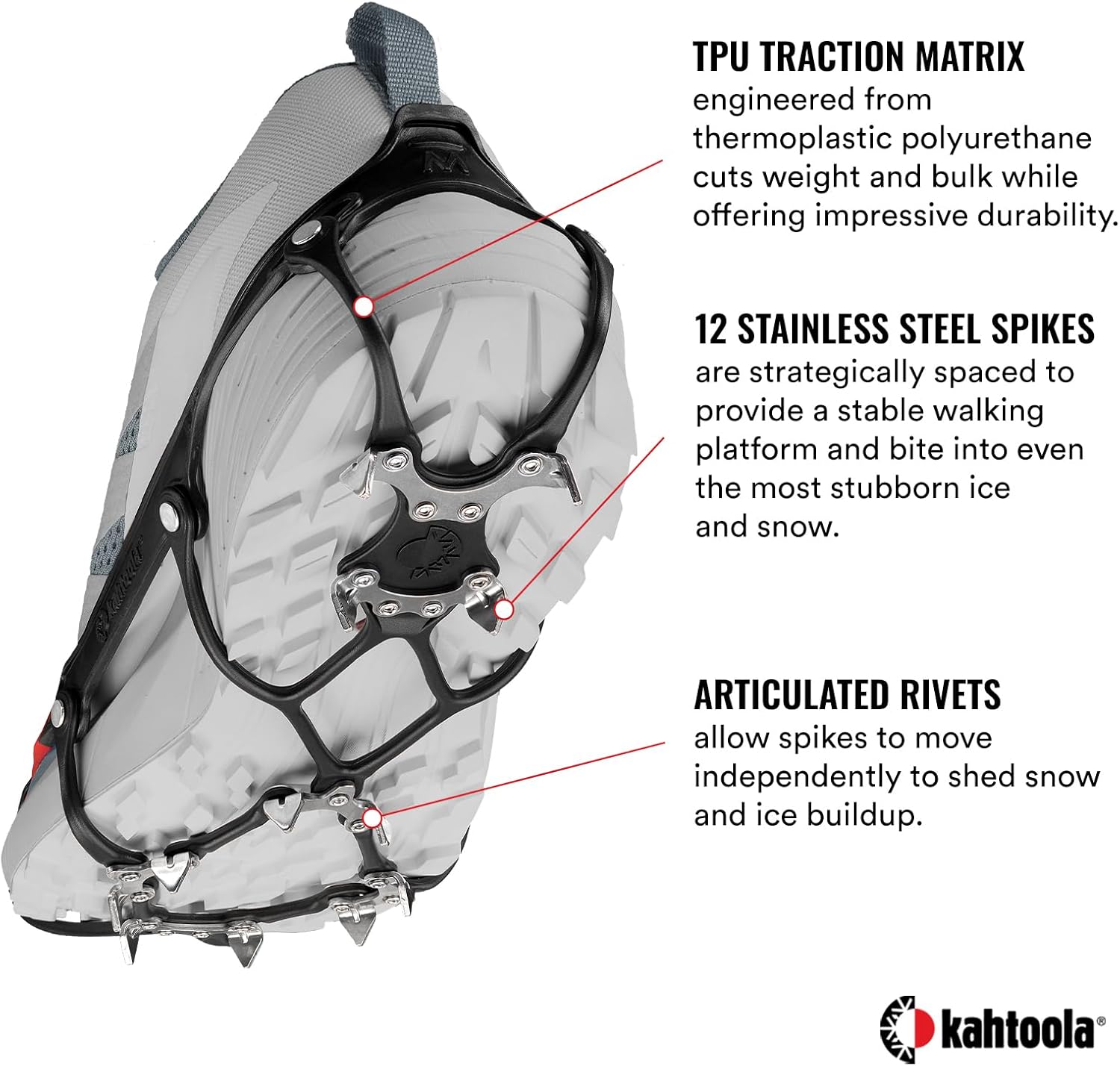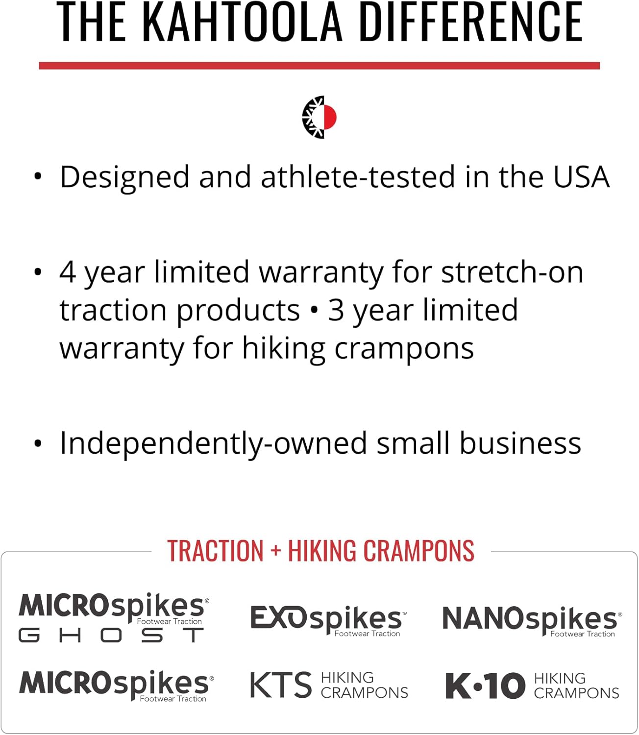 KAHTOOLA: Est. in 1999 Kahtoola is on a mission to build exceptional products that make the outdoors more accessible and rewarding. Please see the sizing chart in product images. 4-year manufacturer warranty. Shoes not included.