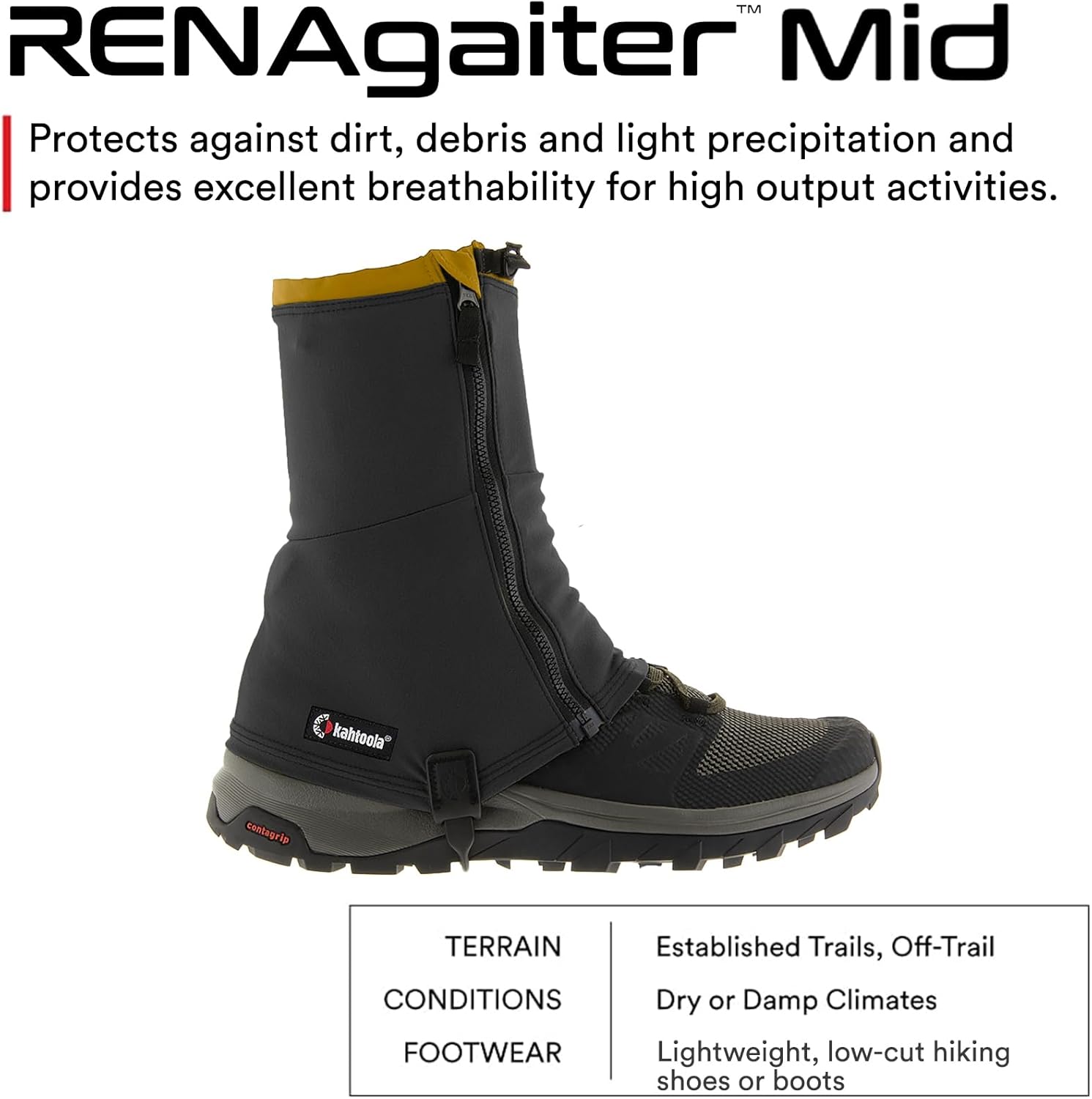 BEST FOR: Designed for use in demanding hiking conditions, the RENAgaiter protects against dirt, debris, and light precipitation on and off-trail. This highly versatile gaiter is ideal for use over lightweight low-cut hiking shoes or boots. (Shoes not included)