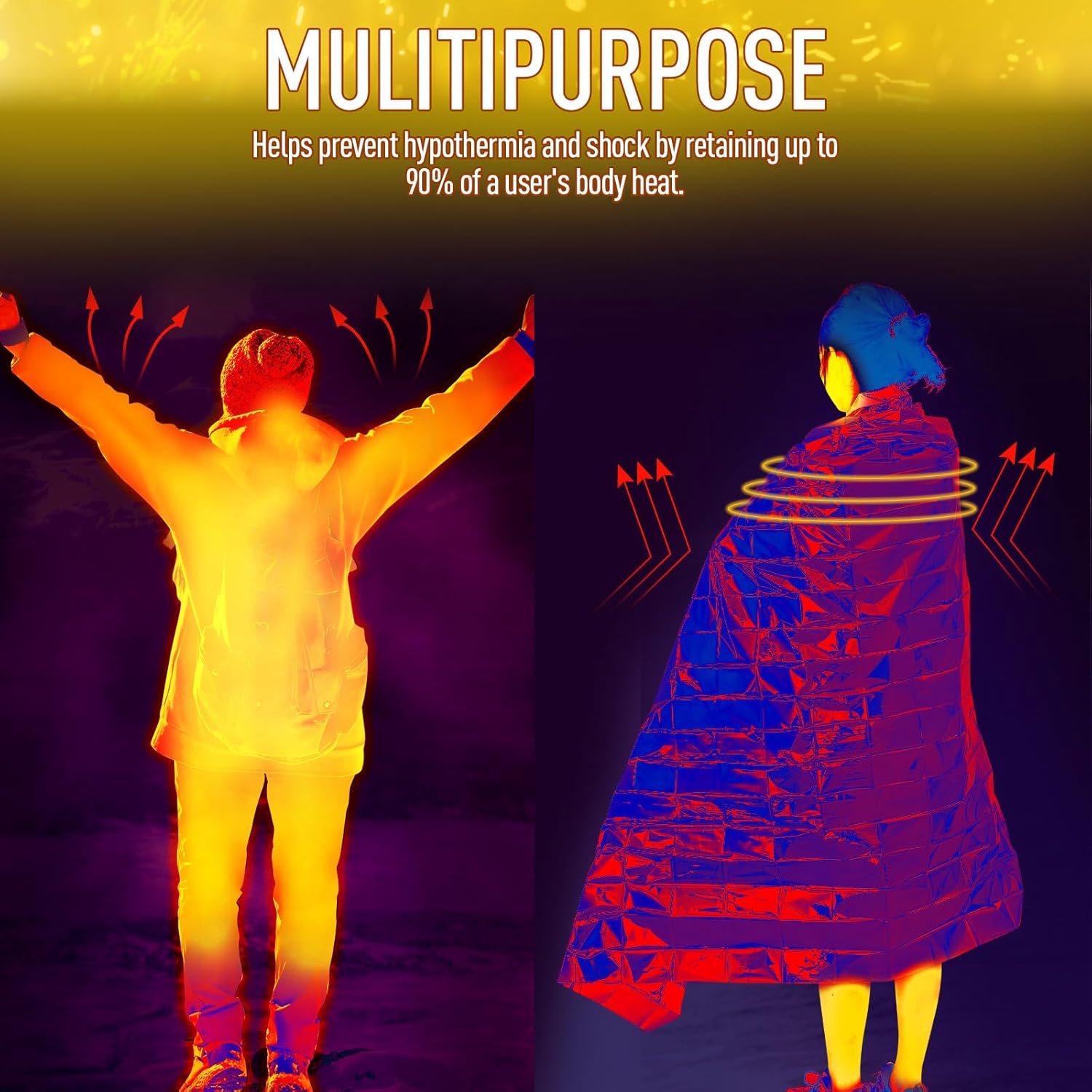 Versatile Applications: these mylar blankets are versatile beyond emergency situations; It can be applied as a bivouac sack, backpack cover, rain poncho, shade cover, arm sling, wind blocker, and more; Its versatility makes it an essential tool for outdoor activities and emergency preparedness