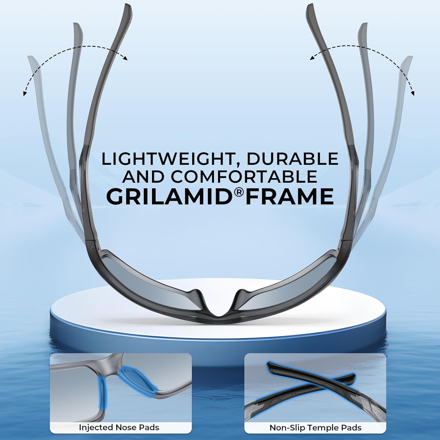 SUPERIOR LENSES – The polarized 1.0mm lenses are comparable to the thickness you would find on much higher priced sports eyewear. They help reduce glare caused by reflected light to improve vision and comfort. The TAC lenses pass a double decentering test to ensure there is no optical distortion which can cause eye strain and headaches. And the oleophobic lens coating creates an oil resistant, fingerprint resistant surface that is impervious to particles like dust and oils.