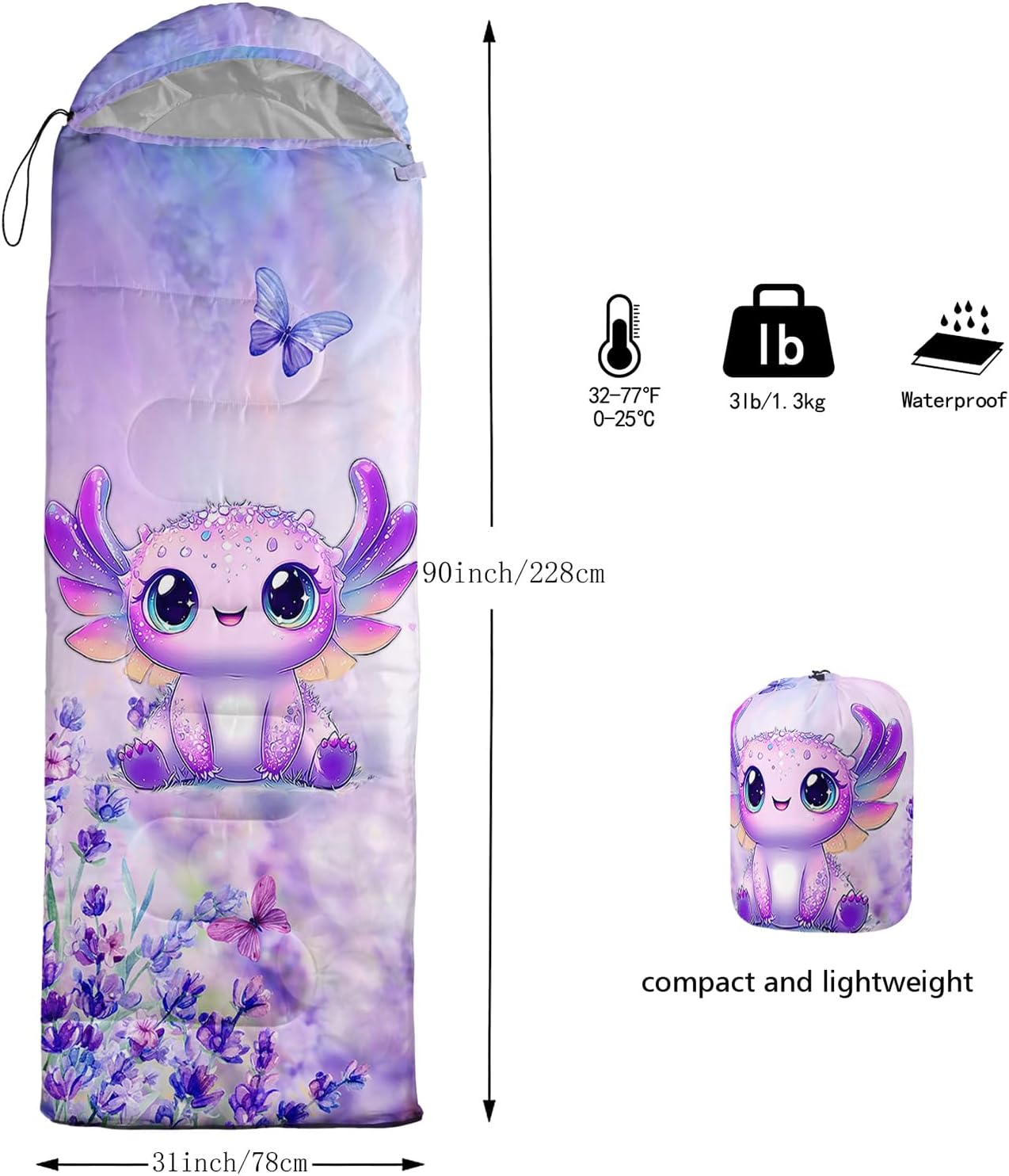 Unique Axolotl Design:This Axolotl pattern sleeping bag is made of 3D digital printing with vibrant colors and patterns,size: 31W x 90L inches,temperature range: 32℉-77℉ (0℃-25℃),it also also have a weather resistant waterproof design to keep you warm and prevent you from any dampness,can be used in 3 seasons