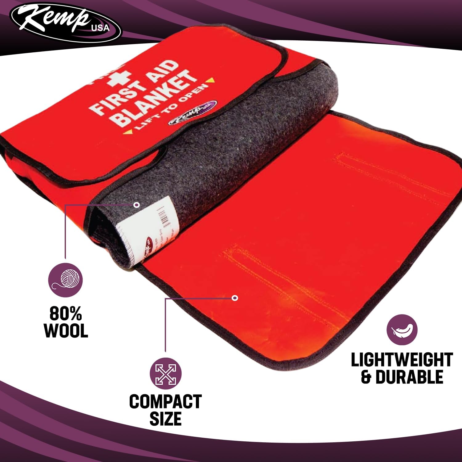 Complete with Kemp USA Wool Blanket – Our first aid blanket bag includes a premium Kemp USA 80 percent wool blanket. A wool fabric is warm, durable, and useful for providing comfort in emergencies.