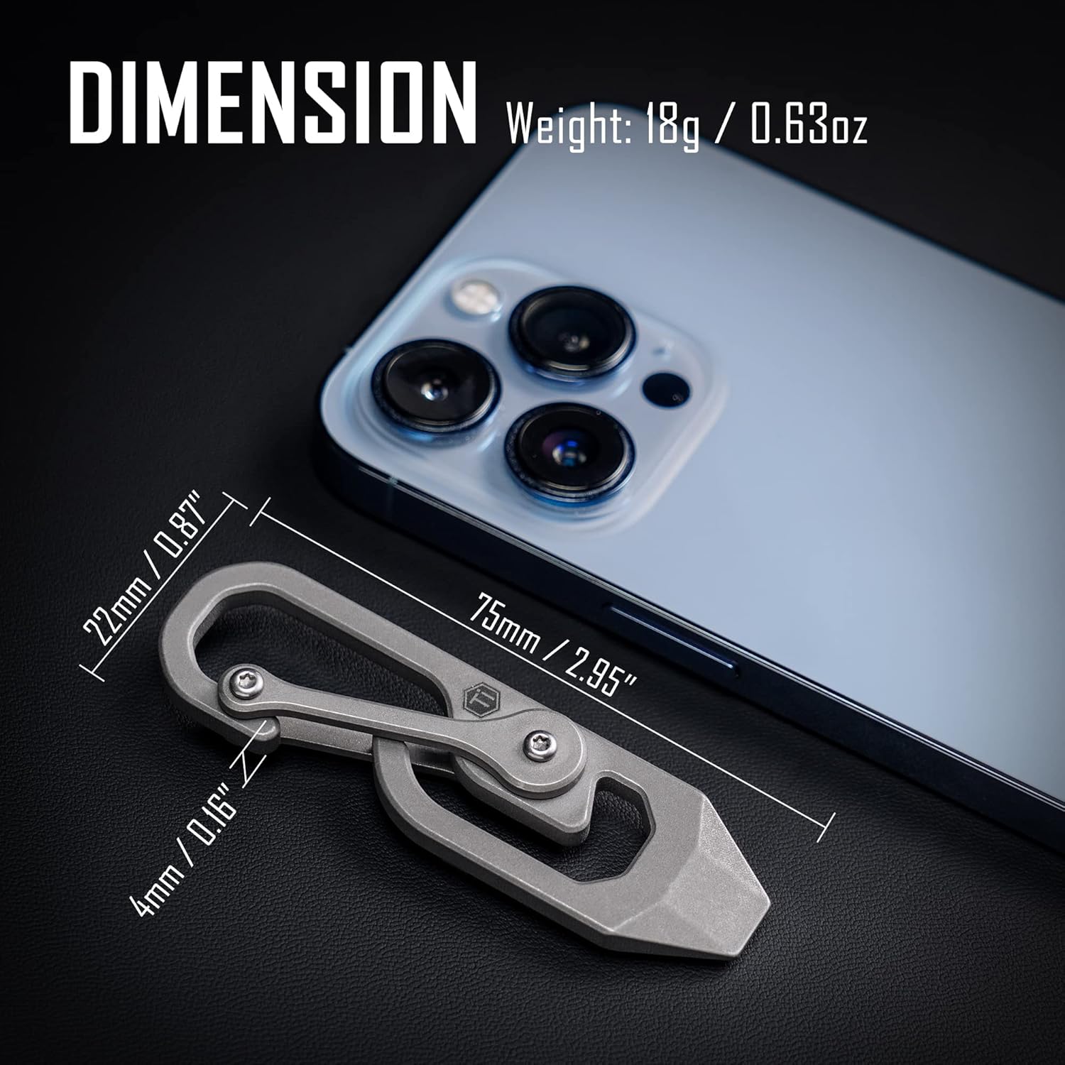 The keychain tool has a perfect size to hold in your hand. Ti-6al-4v titanium alloy material providing you with sturdy strength and durability. Can be used as carabiner keychain, pry bar and nail remover.