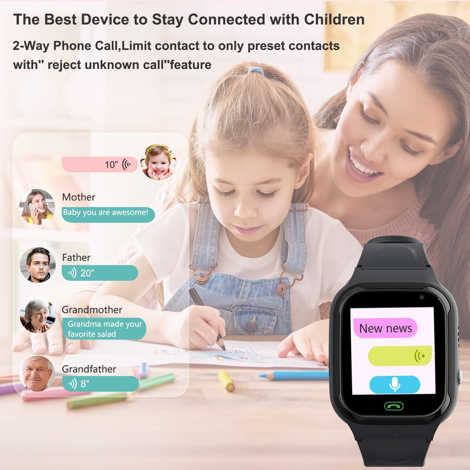 ●Two-Way Video & Voice Calls, communicate with your child instantly through HD video or crystal-clear voice calls.