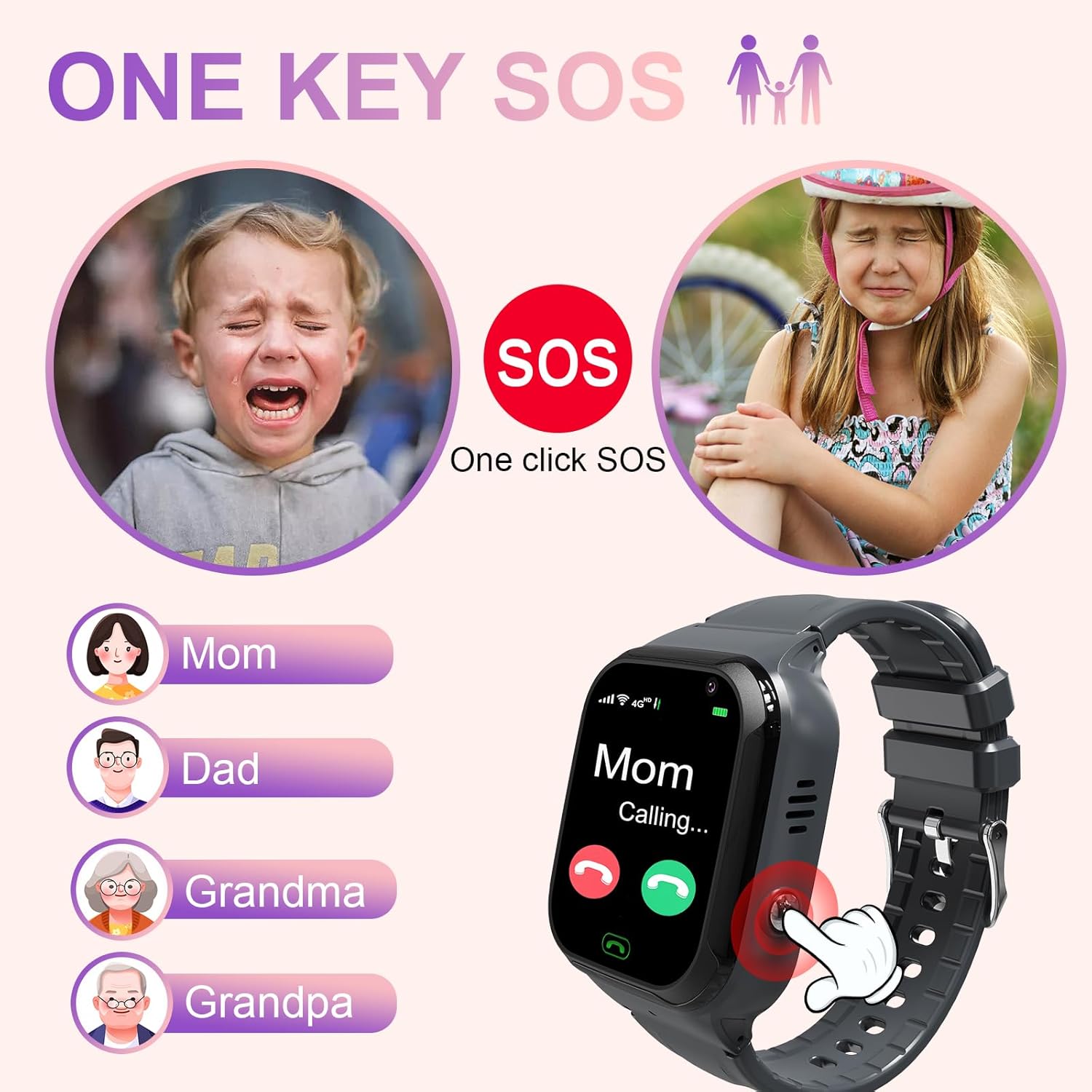 Kids can press SOS button for 3 seconds to circularly call the preset 3 phone numbers for help until someone answers it.