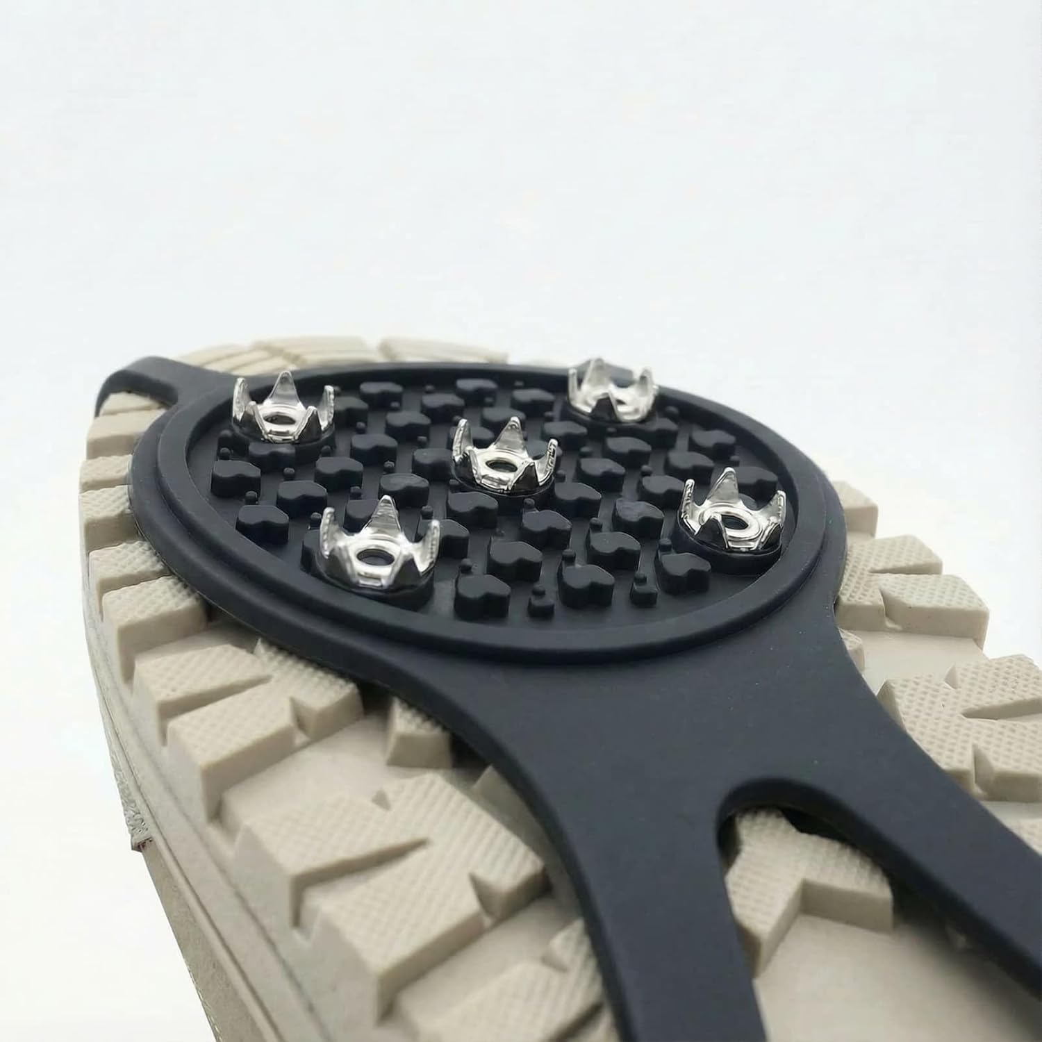 【🔩 Durable Material &Construction】Crafted from high-quality, cold-resistant and reinforced with 5 robust stainless steel studs per cleat, these shoe grips are built for winter’s challenges. The material maintains flexibility in extreme cold, resisting cracks and tears, while the strategically placed spikes dig decisively into ice and packed snow for unwavering stability with every step.