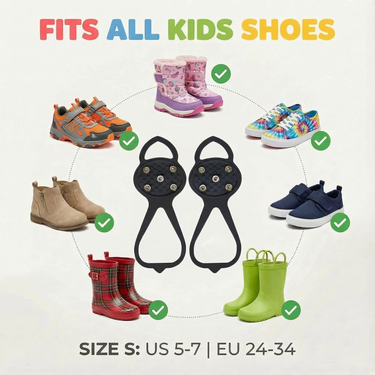 【🛡️ Your Safety Package & Perfect Fit】You will receive 1 pair of our premium kids’ non-slip gripper spikes, ensuring a spare pair is always ready. Designed with a highly elastic frame, these universal ice cleats provide a secure and comfortable fit on a wide range of children’s shoes, from small sneakers to bulky snow boots, offering reliable traction exactly when your child needs it most.