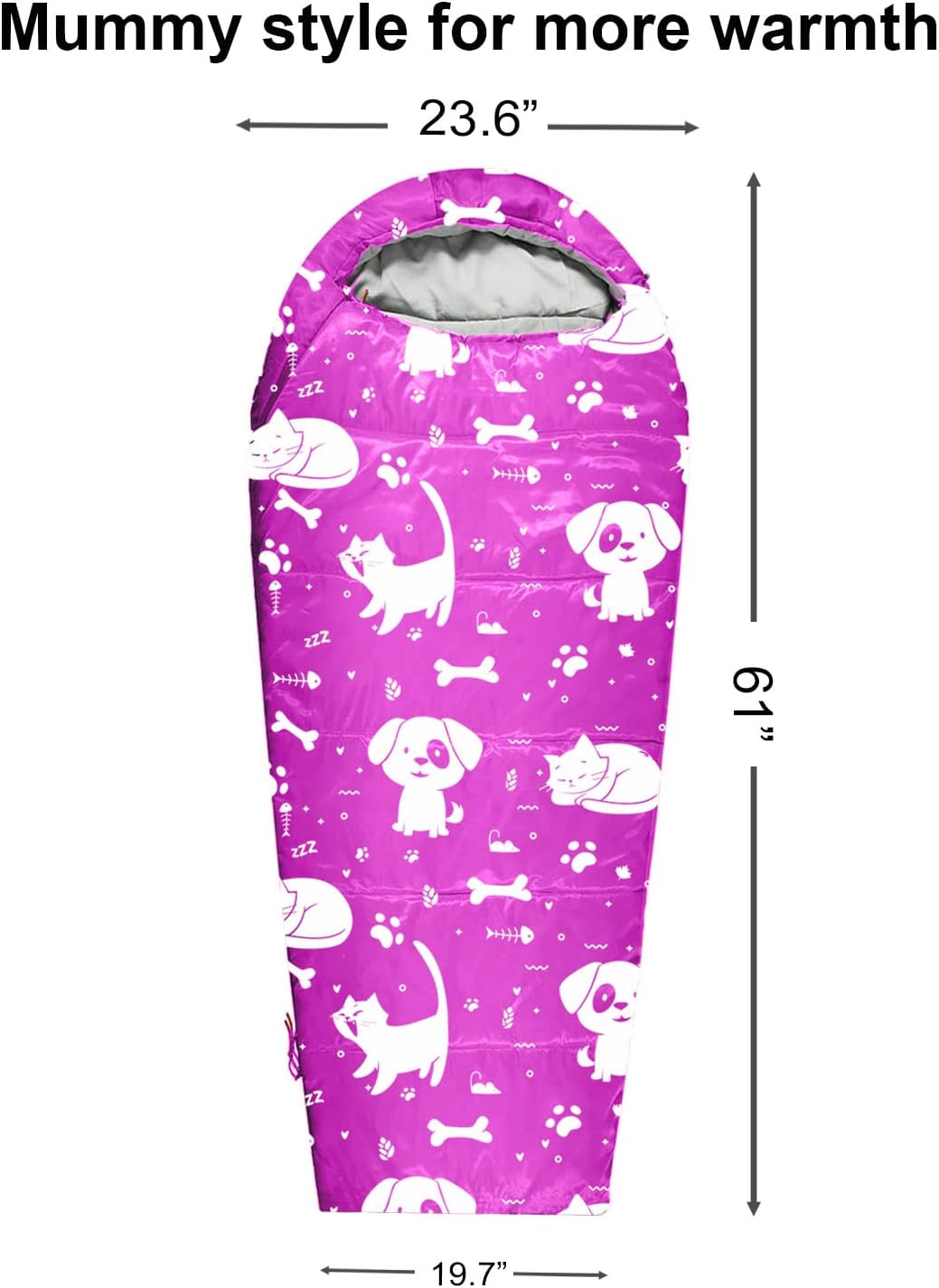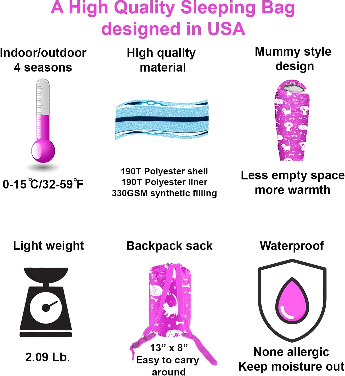 A TRUE 4 SEASON CAMPING SLEEPING BAG (32-59 °F): Unlike other thin sleeping bags, from every step of the design, we kept warmth in mind for our young campers. The mummy style shape reduces unnecessary empty space to keep heat inside. Moreover, the extra draft tube, extra zipper snap, and cozy hoodie all help to keep our customers sleep sound and warm.