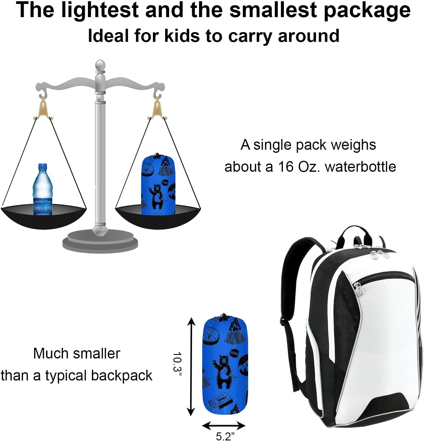 The most compact and lightweight kids sleeping bags: With a weight of approximately 1 pound and packing down much smaller than a typical backpack, this lightweight sleeping bag is perfect for little ones to carry around