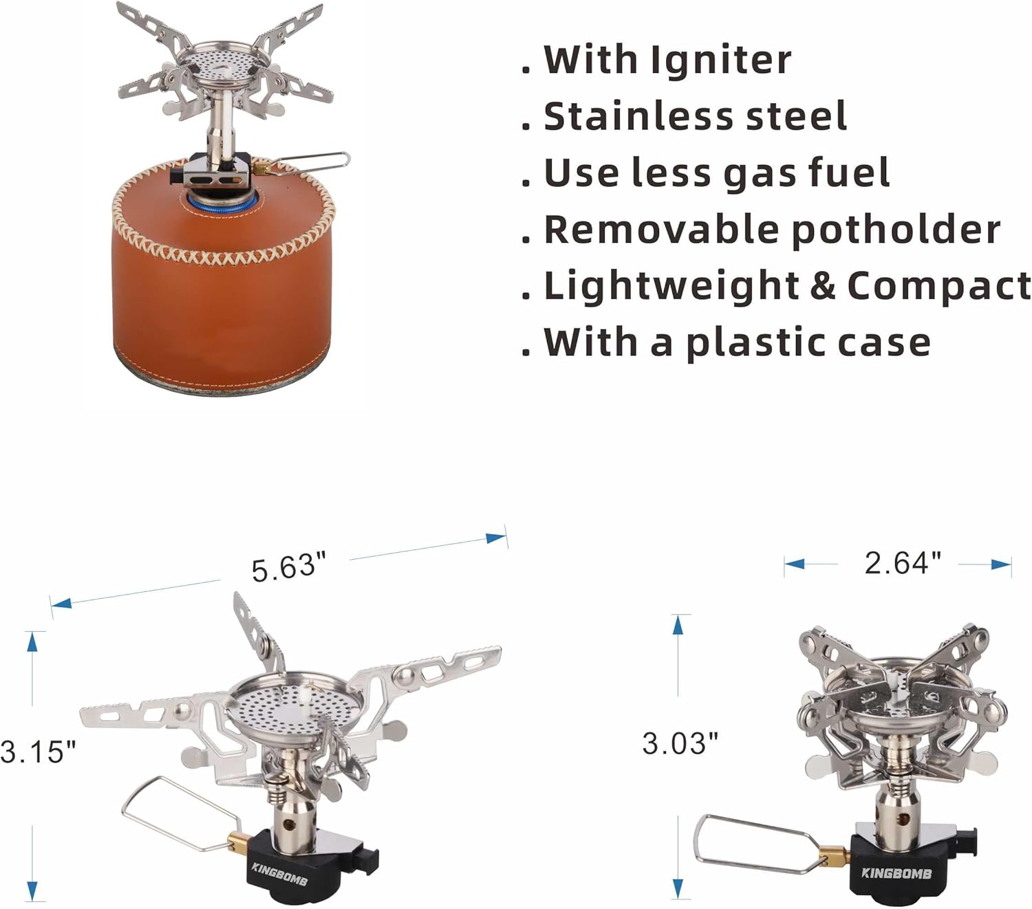 The Kingbomb backpacking gas stove is foldable and can be put in a attached storage bag to take away. It is compact and easily suitable for your camping, backpacking, hunting, BBQ, barbecue and other outdoor occasions.Package includes: 1 x gas stove ; 1 x Plastick Case