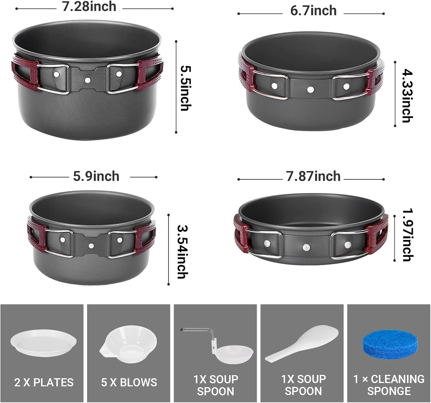 【Premium and Safe Material Camping Cookware】The KingCamp camping cookware pots and pans are made of hard-anodized aluminum with non-stick layer,which has good heat conductivity and easy to clean.You can just wipe up the oil stain and dirt on the mountains.