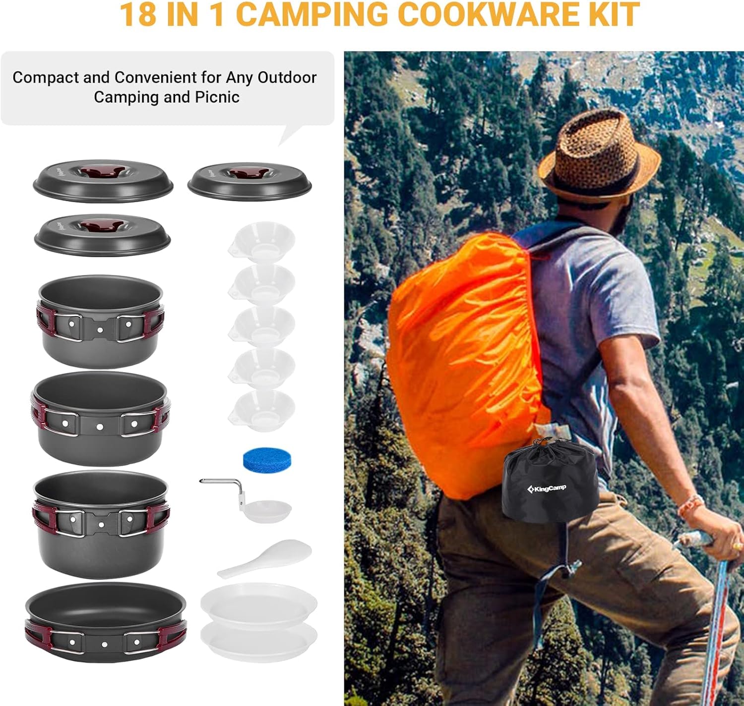 🥾 KingCamp 7/9/18Pcs Camping Cookware Mess Kit Camping Cooking Set Non-Stick Hard-Anodized Aluminum Camping Gear Camping Pots and Pans Set with Tableware for Outdoor Backpacking Hiking Picnic Backyard — Review, Key Features & Current Price