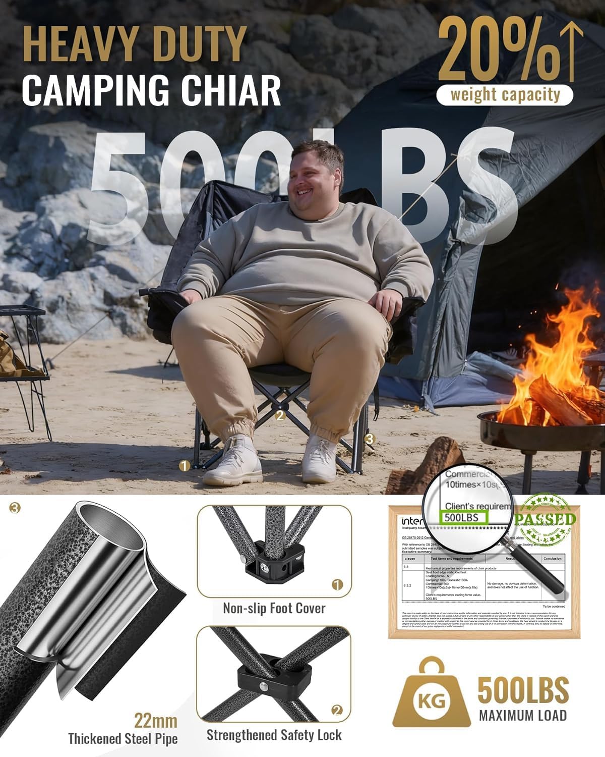 【Heavy-Duty Build】Built with extra-thick steel tubing, a reinforced cross-bar frame, and durable 600D Oxford fabric, this chair supports up to 500 lbs with ease. Anti-slip feet and an enhancing Cross joint ensure stability and security—perfect for high-weight users who need lasting comfort and strength.