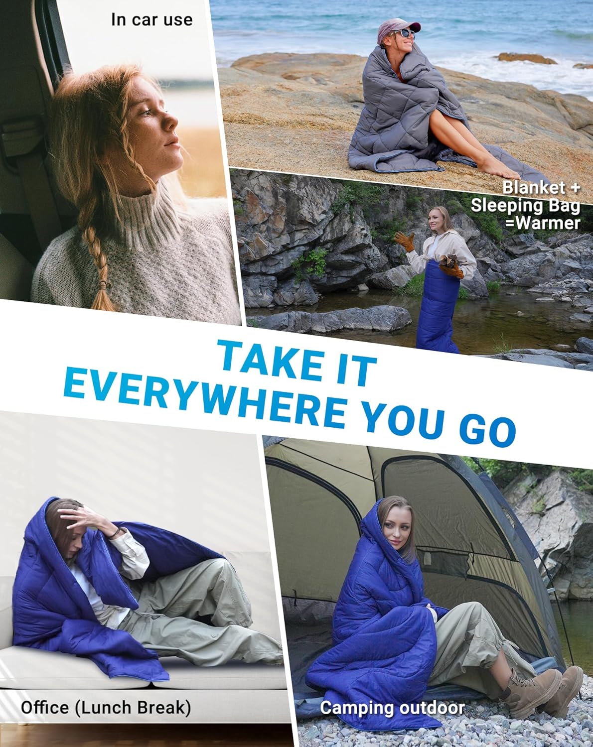 WEARABLE, HANDS-FREE DESIGN & EXTRA-LARGE COVERAGE FOR TWO: With snap buttons for easy transformation, this puffy camping blanket can be worn like a shawl or cape, keeping your hands free for walking around the campsite, watching outdoor sports, or relaxing by the fire.