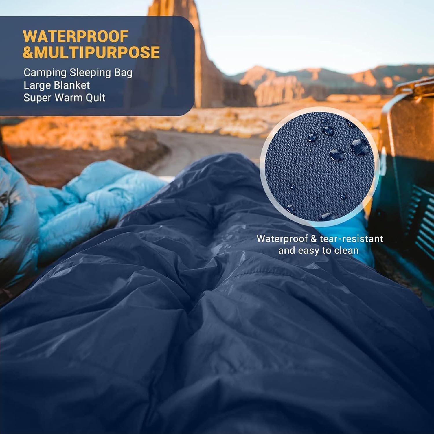 PERFECT FOR CAMPING, TRAVELING and MORE: This queen-size sleeping bag features anti-snag double-sided zippers for smooth access, a Velcro neckline to secure the zipper, and foot zippers for adjustable ventilation. Made with durable polyester and reinforced stitching, it’s built to last. Lightweight at only 8.81 lbs, it packs easily into a compression sack—perfect for outdoor adventures, road trips, and more.