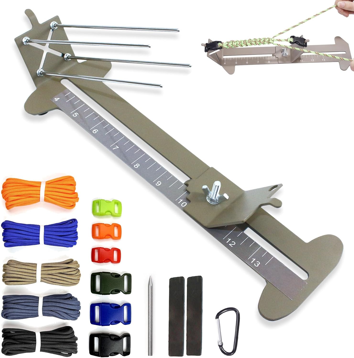 Paracord bracelet jig kit Packing Lists:,1 x Paracord Jig(4″ to 13″),4 x Rods(5.9″ ) with Screws,3 x Fastening Buckles,3 Colors(1.57 x 0.78″ ),3x Fastening Buckles,3 Colors(1.17 x 0.51″ ),5 x Fire Paracord,5 Colors(Length 9.9ft*5,Diameter 0.15″ ),1 x D-shape Metal Carabiner(Length 1.77″ ),2 x Sticky Gel Pads(3.54 x 0.78″ ),1 x (Diameter 0.98″),1 x Paracord FID-roundhead(Diameter 0.15″ )