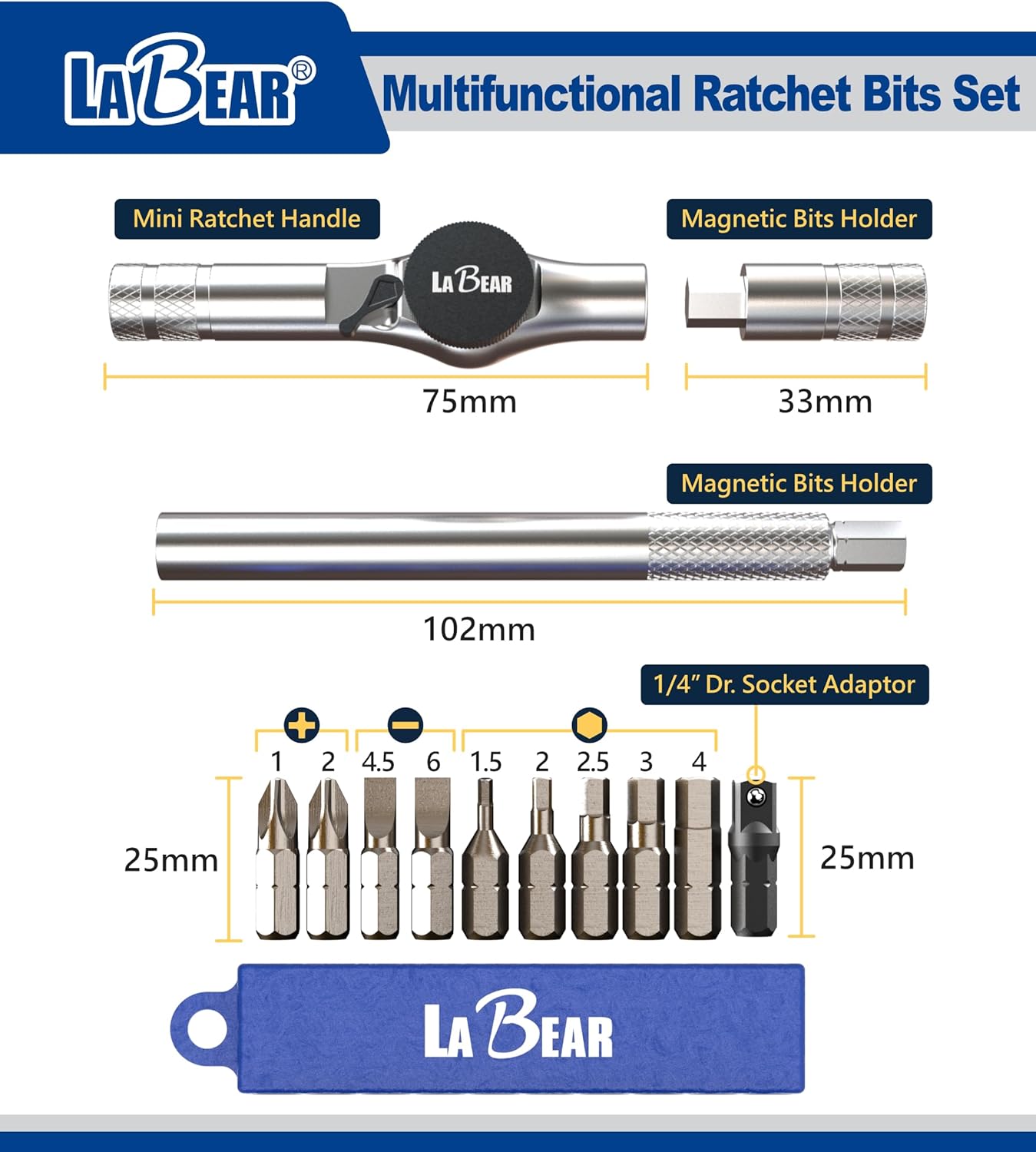【BIT SIZE】: PH1, PH2, SL4.5, SL6, H1.5, H2, H2.5, H3, H4 + 1/4 inch DR. Socket Adaptor