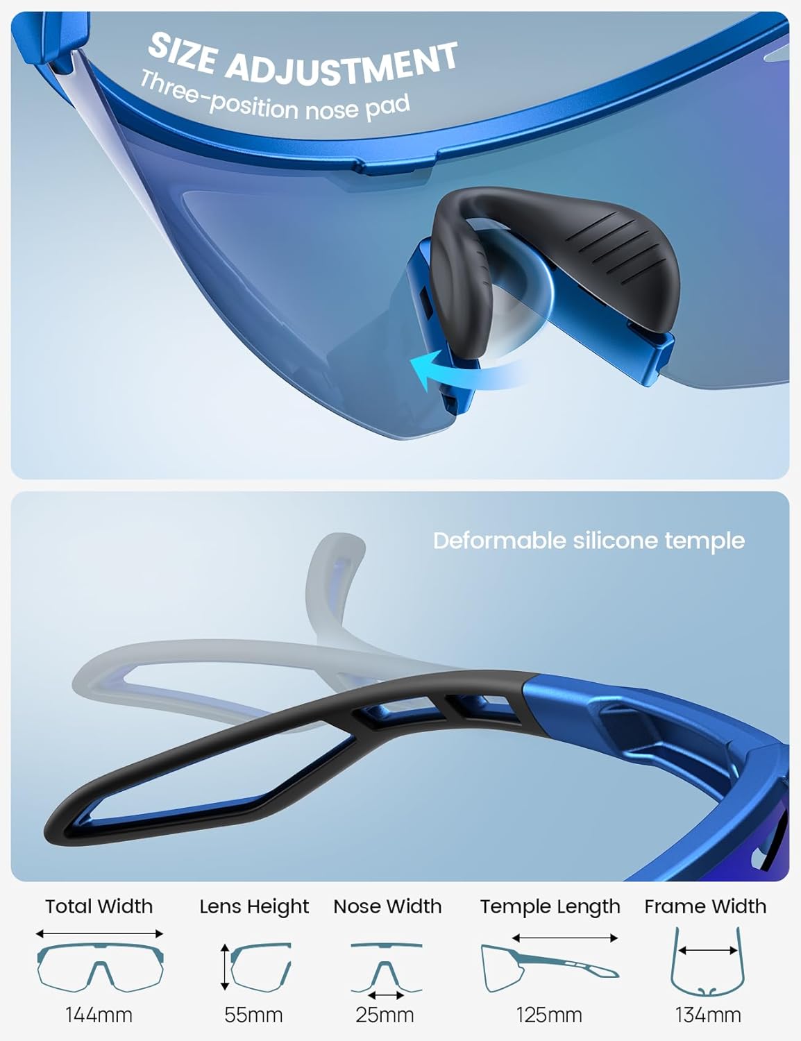 【Size Adjustment for Comfortable Fit】The nose pads are designed with three adjustable levels, you can freely adjust the height of the nose pads, the temples are designed with skin-friendly silicone, making it more comfortable to fit different facial shapes.