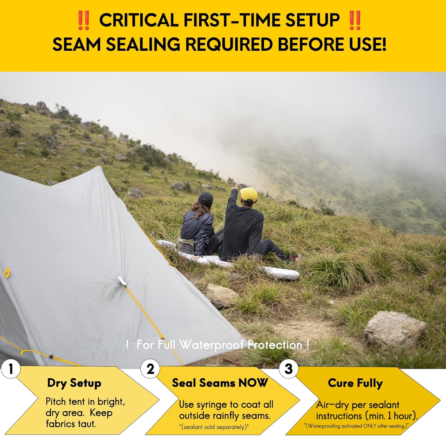 ATTENTION: Lanshan Pro is made of two-side silicone-coated nylon, because of the features of the double silicone fabric, this tent cannot be sealed at the factory. When you receive the LANSHAN Pro tent, you need to use sealant to apply along the blue dotted line. Hands-on skill and ability will be required, consider before purchasing. Seam sealant is not included. Sealant brand recommended: SEAM GRIP+SIL