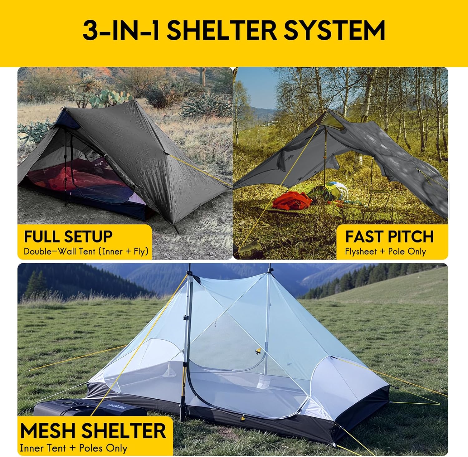 QUICK SETUP TENT: Easy to setup and take down in any conditions. Connected the outer and inner tent with hooks, reinforced by wind rope and tent stakes. Assemble in 5-10 mins with the hiking pole (NO TREKKING POLES PROVIDED)