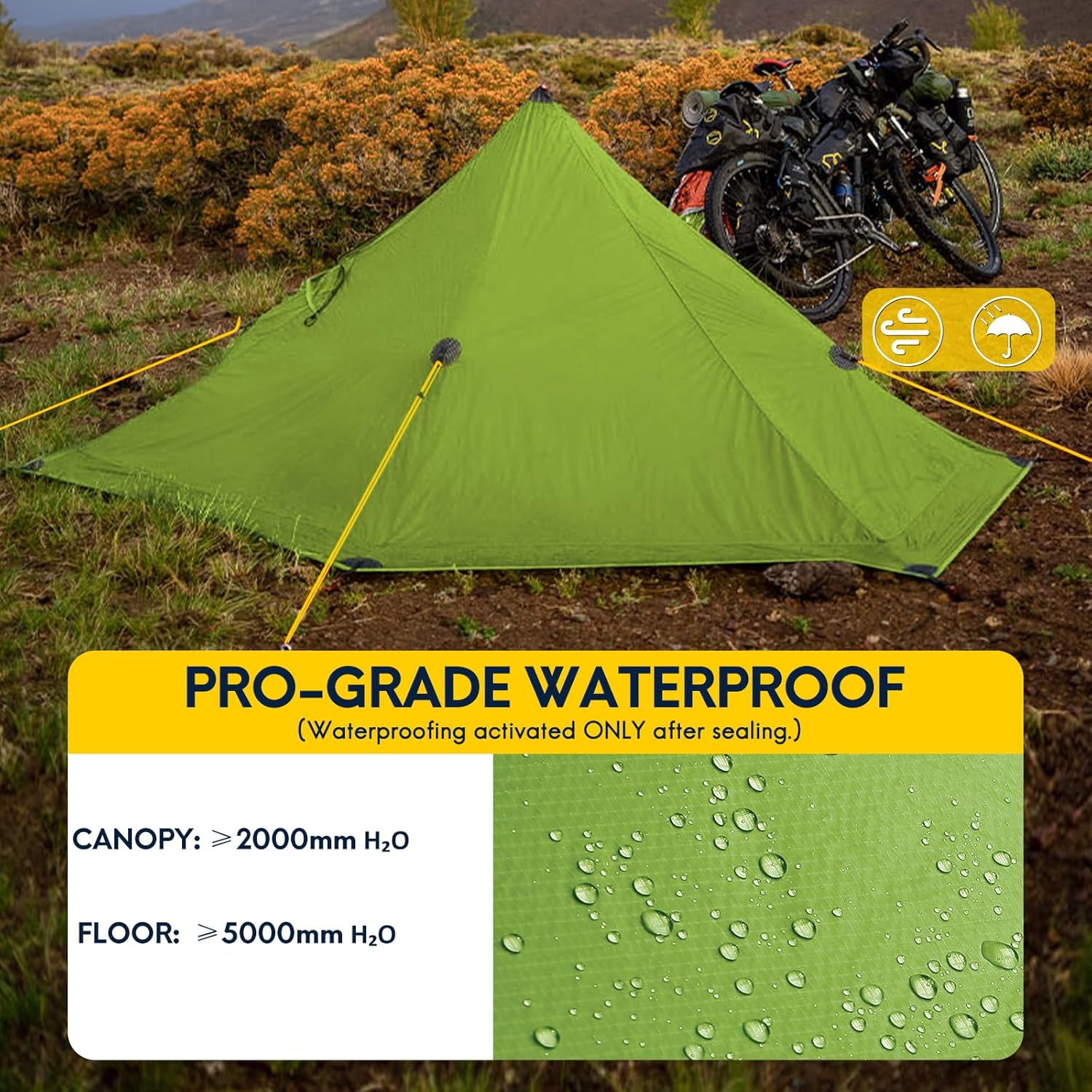 VERSATILE ULTRALIGHT TENT: 1 ventilation window. Easy to get into the tent, and plenty of space to keep your pack. The bottom of the tent and the body of the tent are connected through the mesh so that condensing water can be discharged through the mesh. Connect the tent with hooks, reinforce by wind rope and tent stakes. Assemble in 5-10 mins with the hiking pole. (NO TREKKING POLES PROVIDED!) Combination of inner tent and rainfly which prevents from wet and keep dry