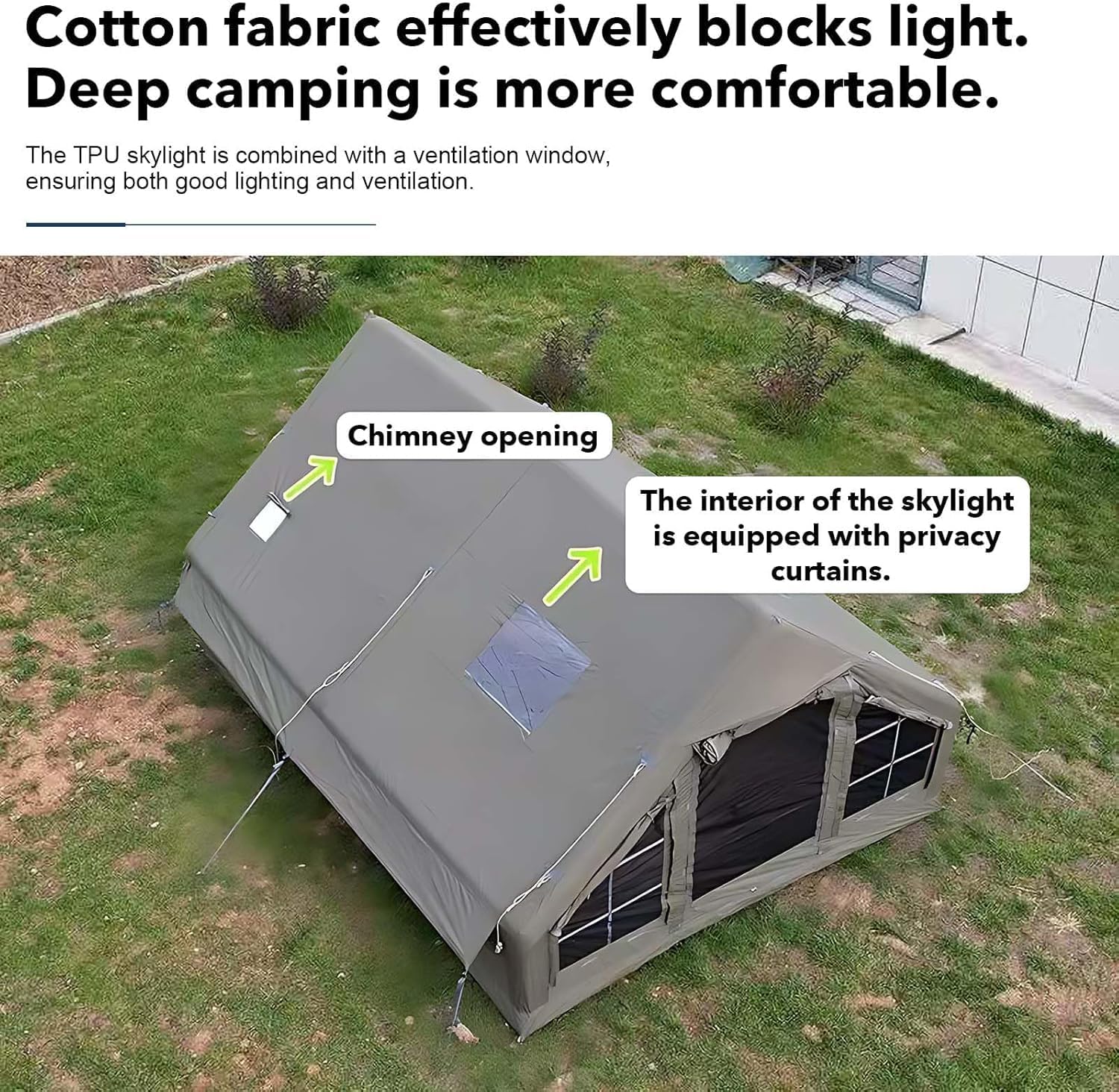 🎈🚫💨【Tested for 48 HOURS Without Leakage】This Glamping Tent is made of high-density 420D Oxford fabric, waterproof and UV resistant, the waterproof index is PU3000mm. Distributed sun and rain guards provide stability and make your trip more comfortable. As for the 6-inch (15cm) thickened high-density TPU air beams, which is better than PVC, ensuring that Your Inflatable Camping Tent can withstand heavy wind and rain.