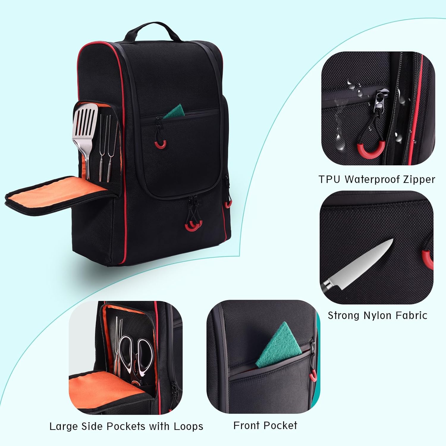 Large Capacity With Multiple Pockets: Extra large size: 18.5 X 14 X 5.5 inches. 2 nylon mesh pockets and 2 loops on the upper of the main compartment provide a clear view of the tool’s storage. 3-layer inner pockets with a safe strap, help to safely store dishes, cooking tools, and some condiment caddy. The External 2 side pockets and 1 front pocket hold griddle or other long-size cooking tools, and more.