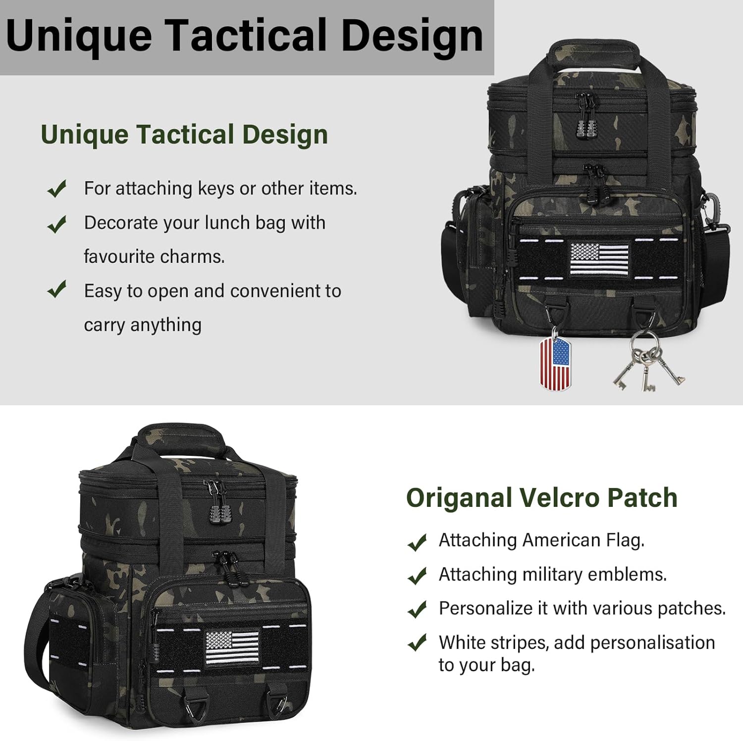 Unique Tactical Style: With a large Velcro Patch on the side and front pockets, you can customize the lunch box with various patches, to cater to your wide range of needs and preferences. Comes with the American flag to showcase your national pride, adding a touch of personality to the lunch cooler. Two Hang buckles for attaching keys or other items.