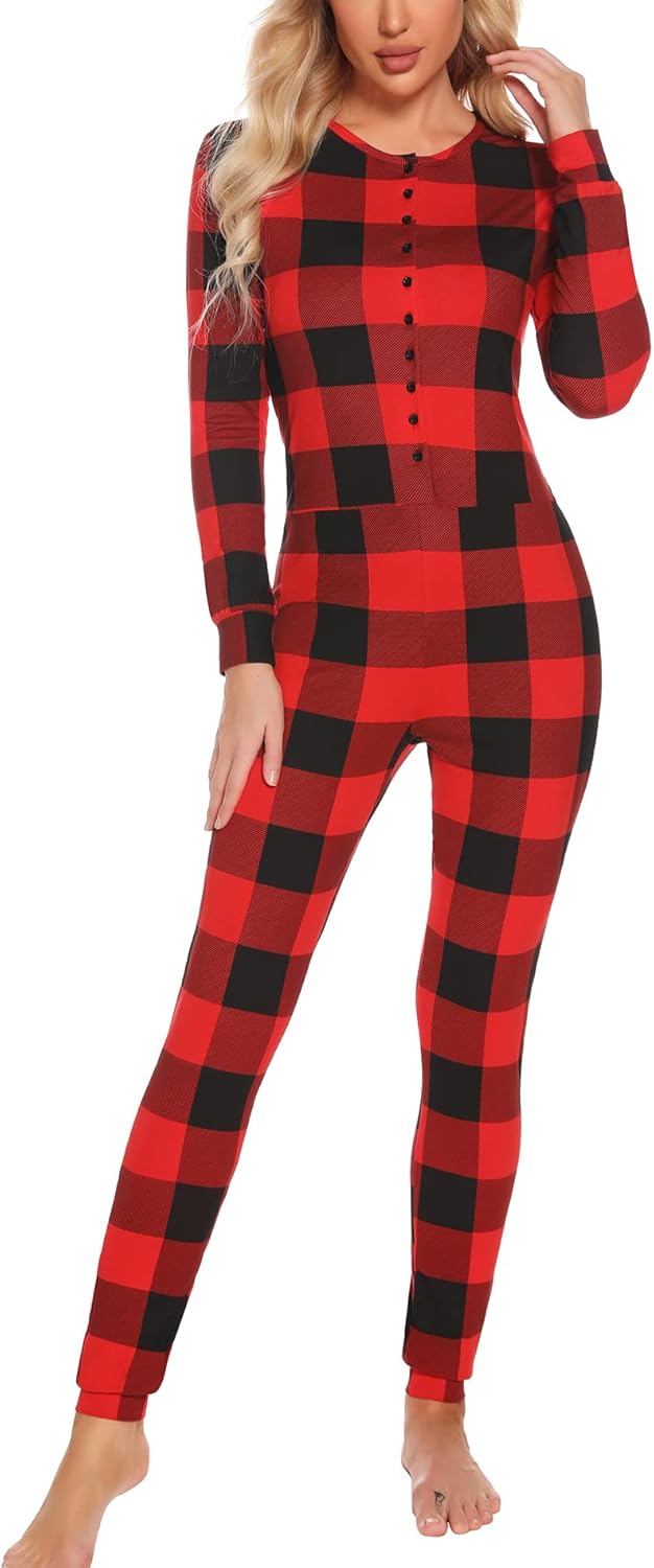Christmas Pajamas Set for Women Buffalo Plaid One Piece Plaid Button Romper Pjs