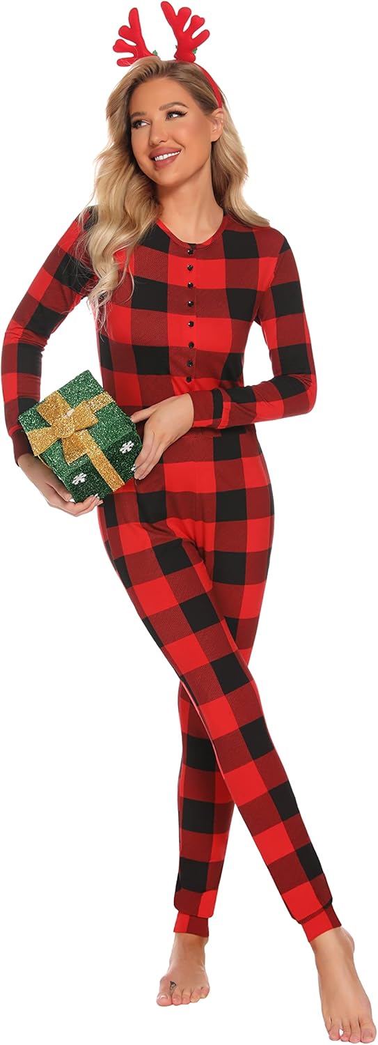 Christmas Pajamas Set for Women Buffalo Plaid One Piece Plaid Button Romper Pjs