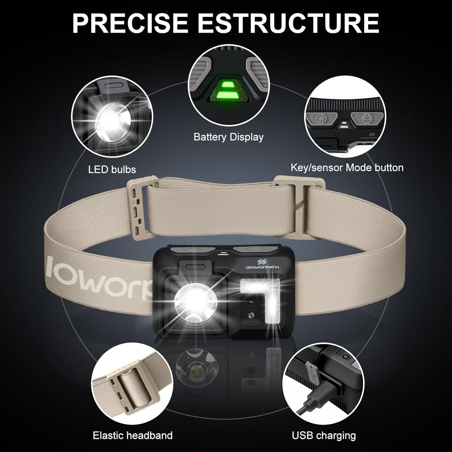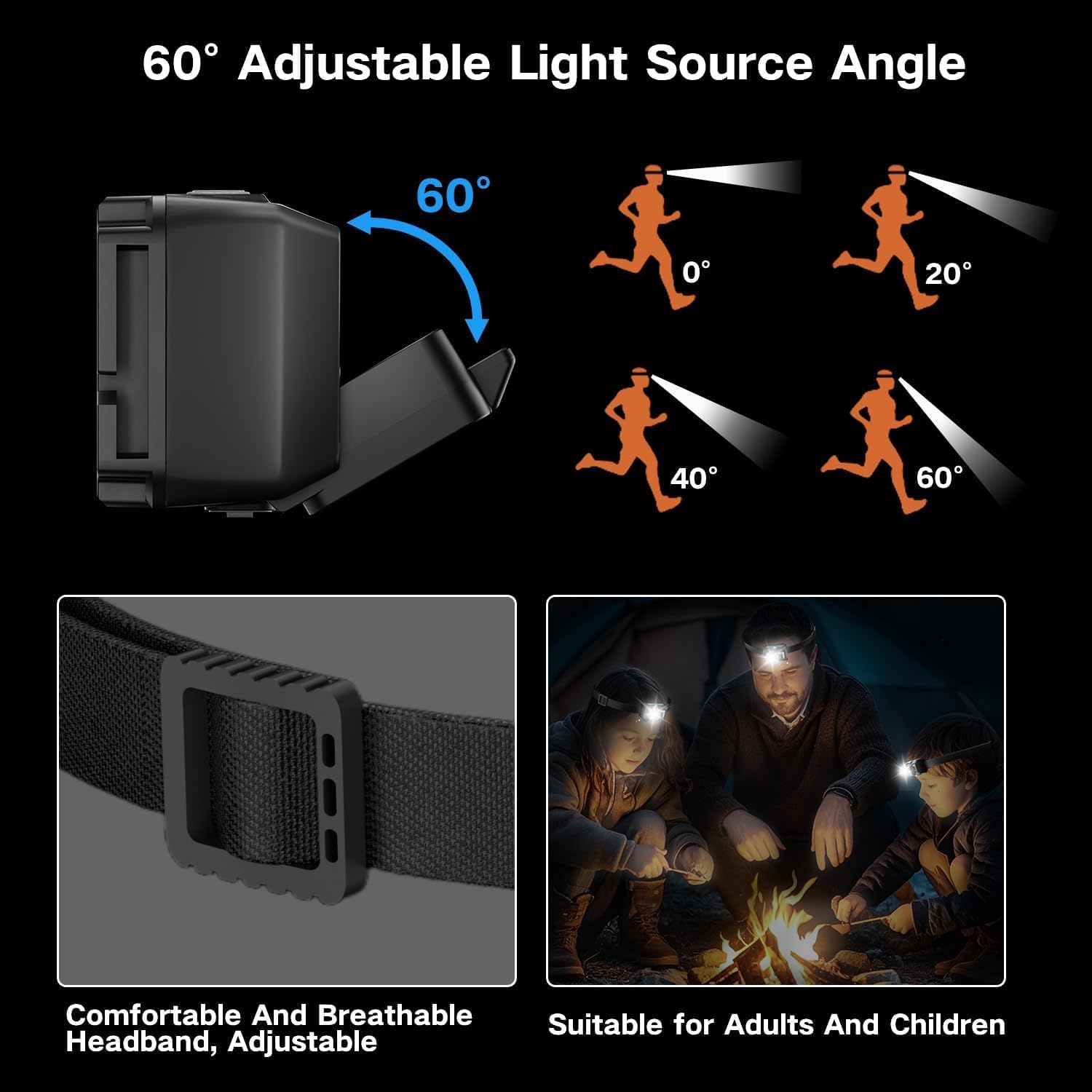 【Super Bright & USB-C Rechargeable】Super bright headlamp flashlight adopts first-class LED chips,the beam is brighter and more stable, and can easily illuminate everything around you. Built-in 1200mAh large-capacity rechargeable battery, easily rechargeable via USB C. giving you longer lighting time and easier charging experience.
