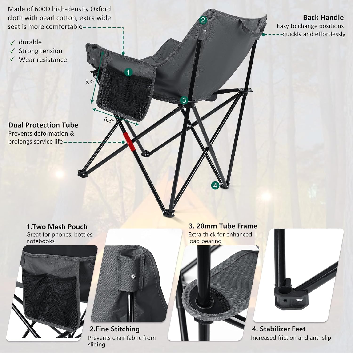 Comfort & Material, portable camping chairs are made of 600D oxford fabric sandwiched with pearl cotton, allows you to sit more comfortably, fine seam edging for longer service life, come with 4 non-slip feet, stable and not easy to move