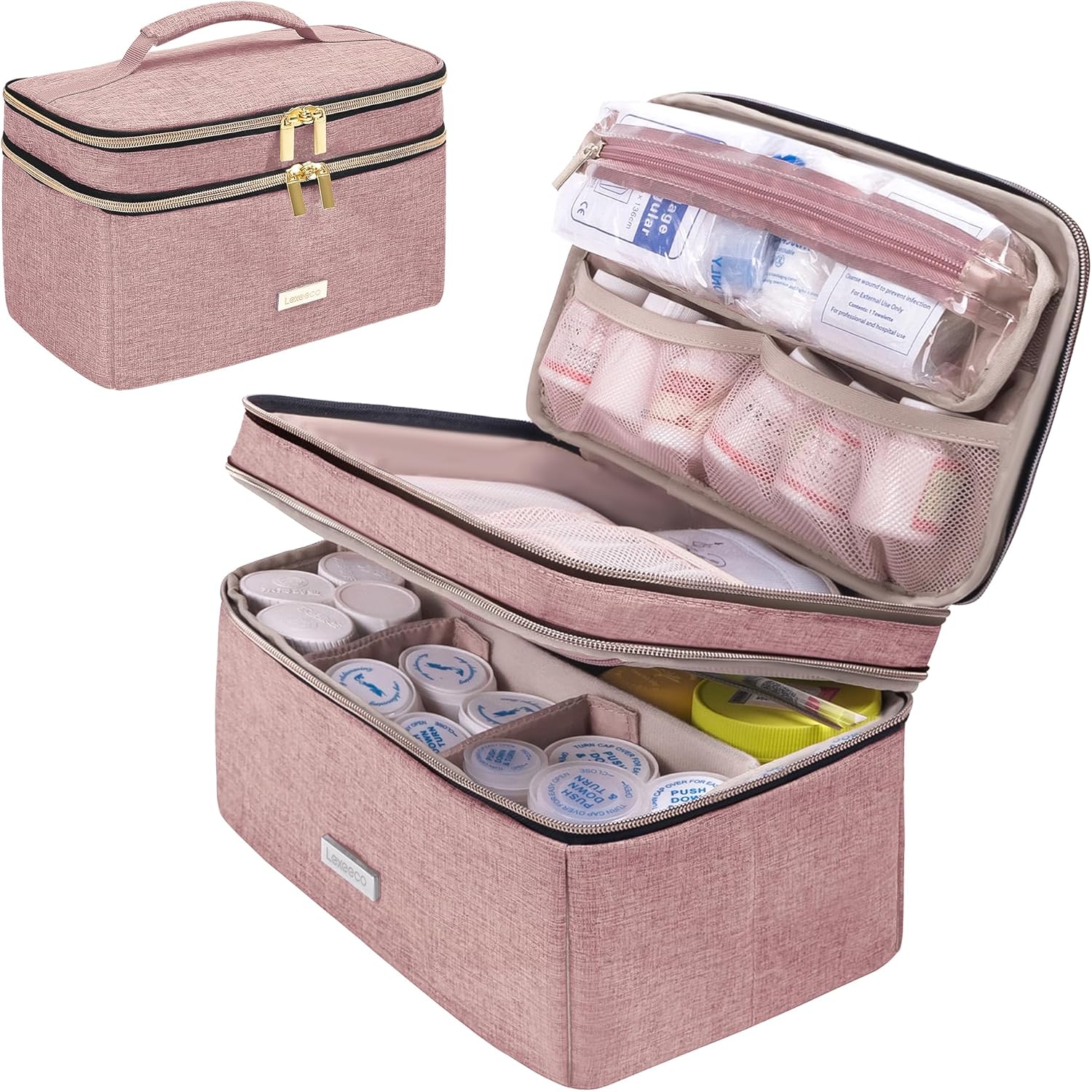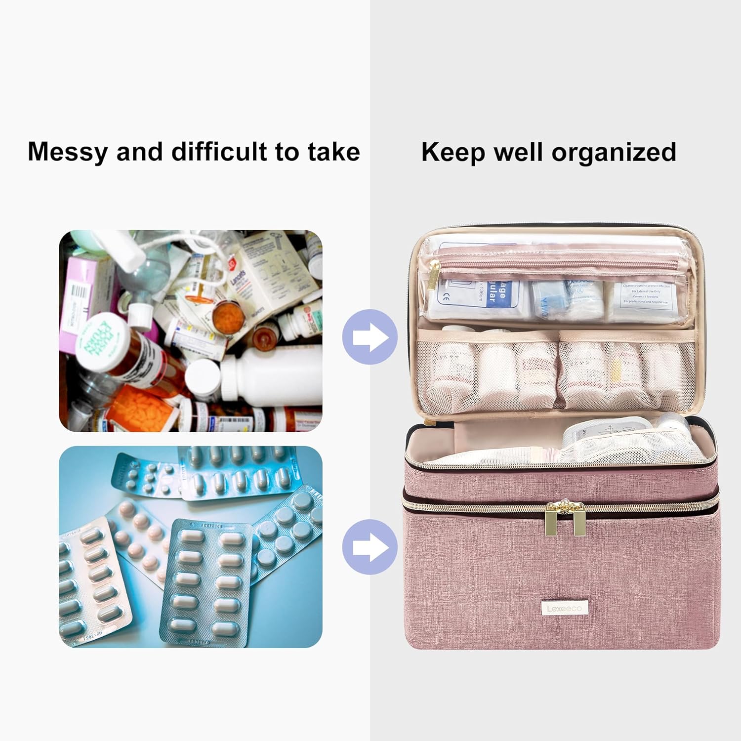 Double-layer room:The top compartment provides extra space, and also classify medicine bottles according to their different use. Meanwhile, this bag comes with a removable transparent pouch for precious supplies.