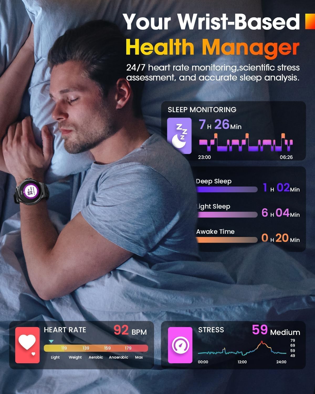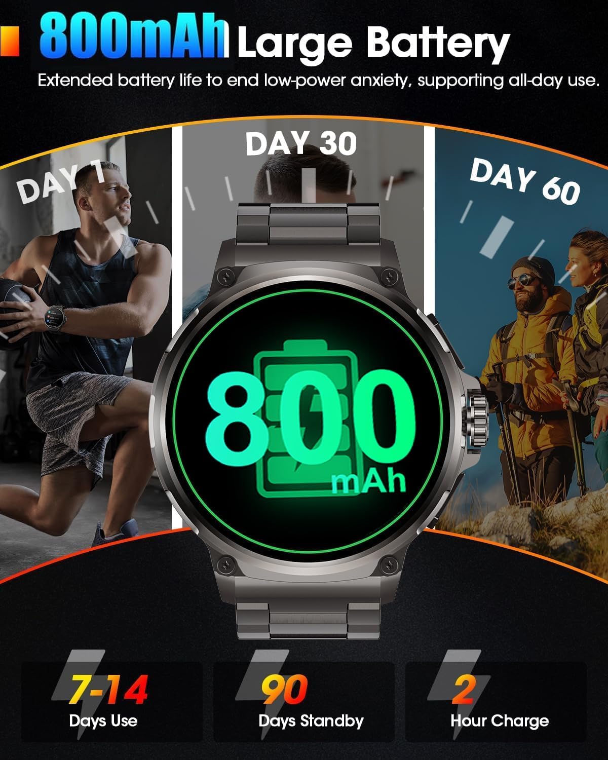 🔋【800mAh Battery – Standby Time up to 60 Days】This android smart watches for men is equipped with a military-grade 100% pure cobalt battery and features a 800mAh capacity. It supports continuous use for 8–14 days under normal conditions and offers a standby time of up to 60 days. The men’s smartwatch is powered by an energy-efficient processor chip and AI algorithms that minimize power consumption during task execution and optimize task distribution. Even with the 1.85-inch large display, it delivers long-lasting battery life during daily intensive use.