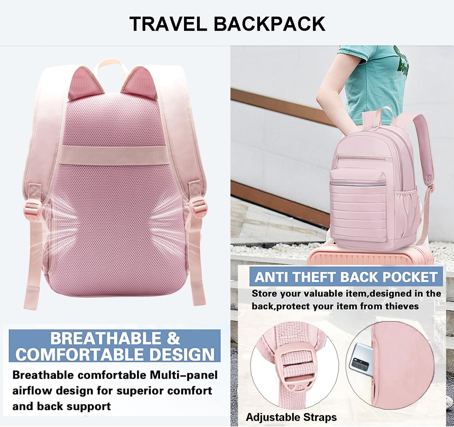 Multi functional: Our backpack has a luggage strap on the back panel, which can be placed on the luggage handle for easy travel. A hidden anti-theft pocket to protect your important items. The front bag is made of made of waterproof thermal insulation material, can be used as lunch bag.