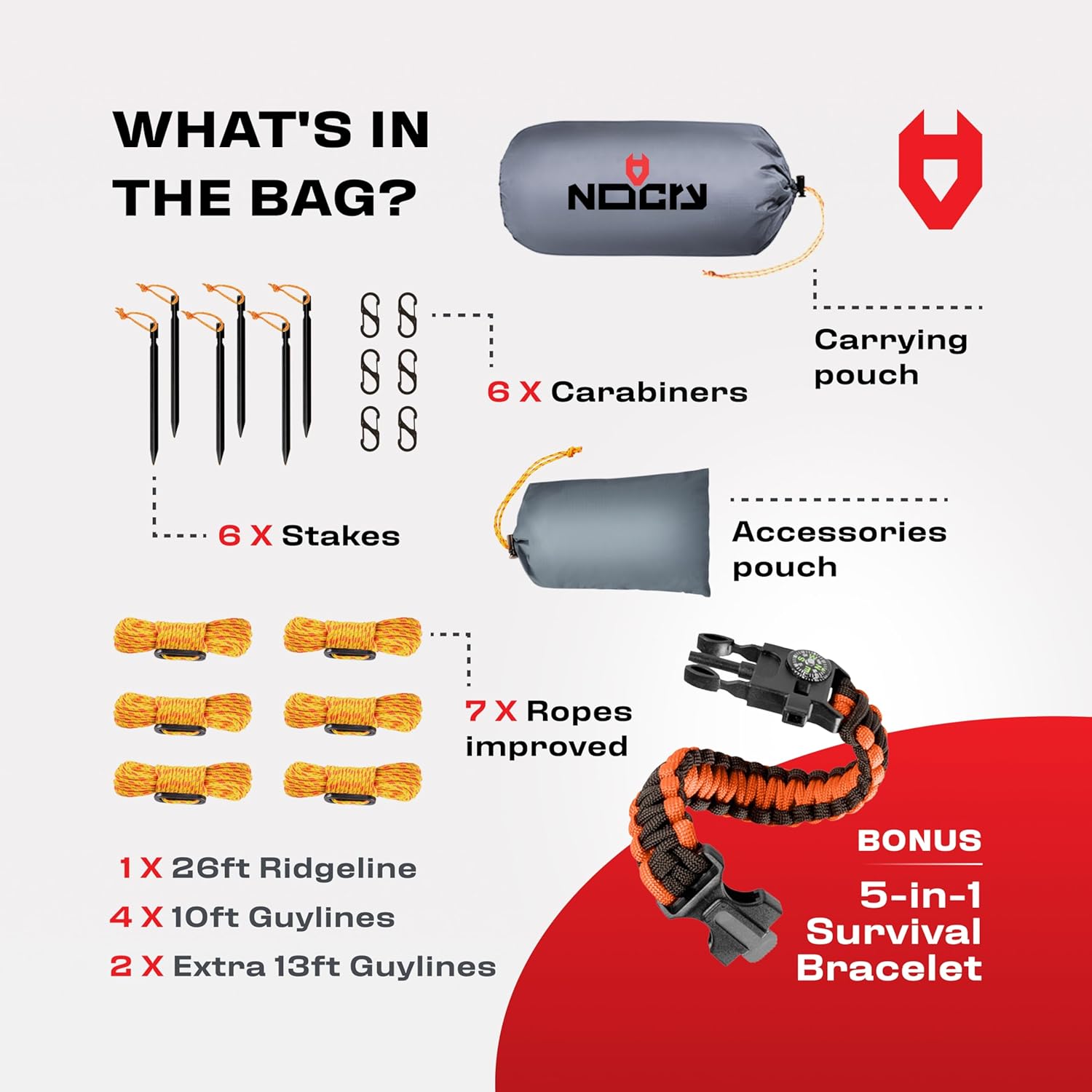 THE GEAR YOU NEED IN ONE PLACE. Comes with 1 rainfly tarp, 6 aluminium stakes with orange reflective paracord ties, 6 carabiners, 7 adjustable ropes, 1 sack for the ropes and poles and 1 carrying pouch for all your gear. Just pack them together and put them in your bag. And, as a bonus, we’ve added a survival bracelet too!