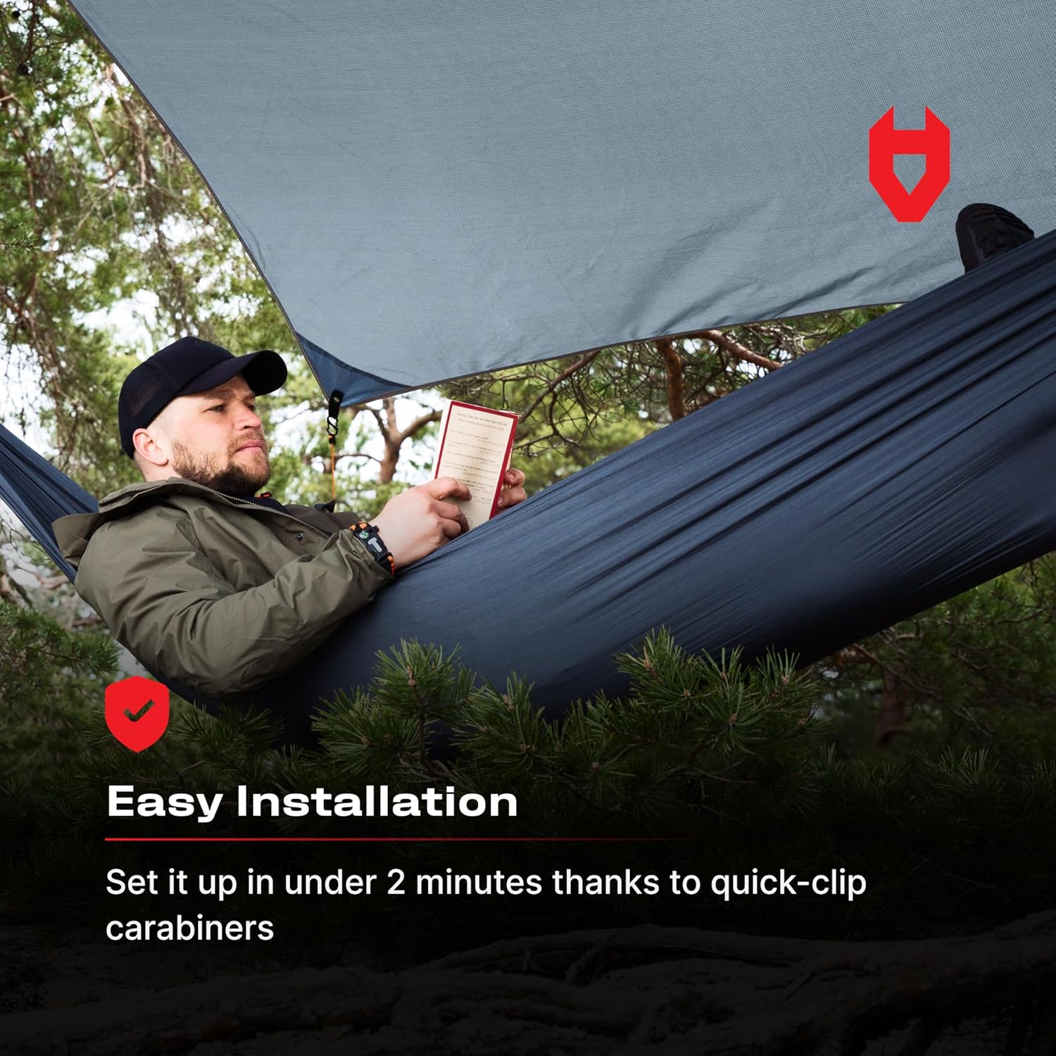STAY DRY WITH 100% WATERPROOF HAMMOCK TARP. Protect yourself from rain, wind and snow with this dirt-resistant, waterproof rain tarp. Suspend it above ground as a hammock cover. Or use it as a tent groundcover, a windbreaker, backpacking tarp, or survival tent.