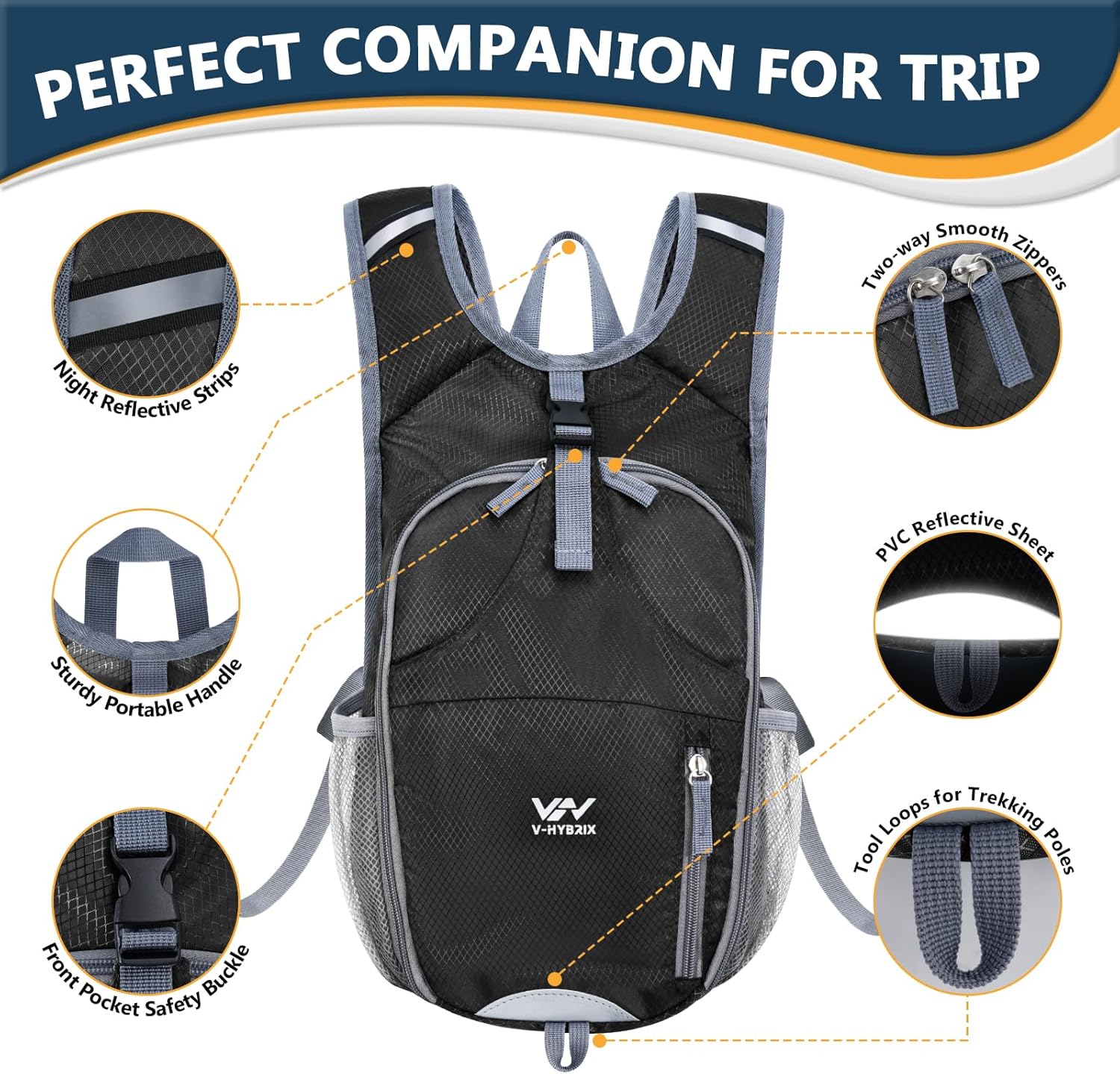 ✅【LIGHTWEIGHT & COMFORTABLE】Weighing only 0.5lb(250g), VHYBRIX Hiking Daypack is very light weight even much lighter than an IPhone. The shoulder straps are well cushioned and distributes the weight evenly, fully adjustable for shoulders for comfortable fit. With breathable mesh padding for relieving fatigue & ventilation, this small backpack for hiking keeps your pack cool and your back dry.