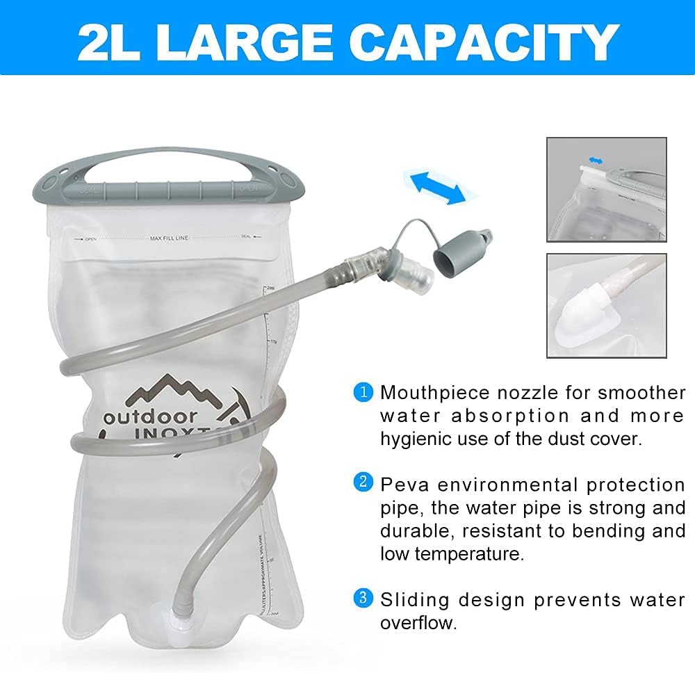 【2L Hydration Bladder 】◕‿ ◕:The 2 liter hydration water bladder can fill water and ice super quickly, it is more convenient to clean no matter when the water temperature is range -20~+50℃.the water tube (40″length,0.4″diameter) provides a healthy flow for easy drinking.