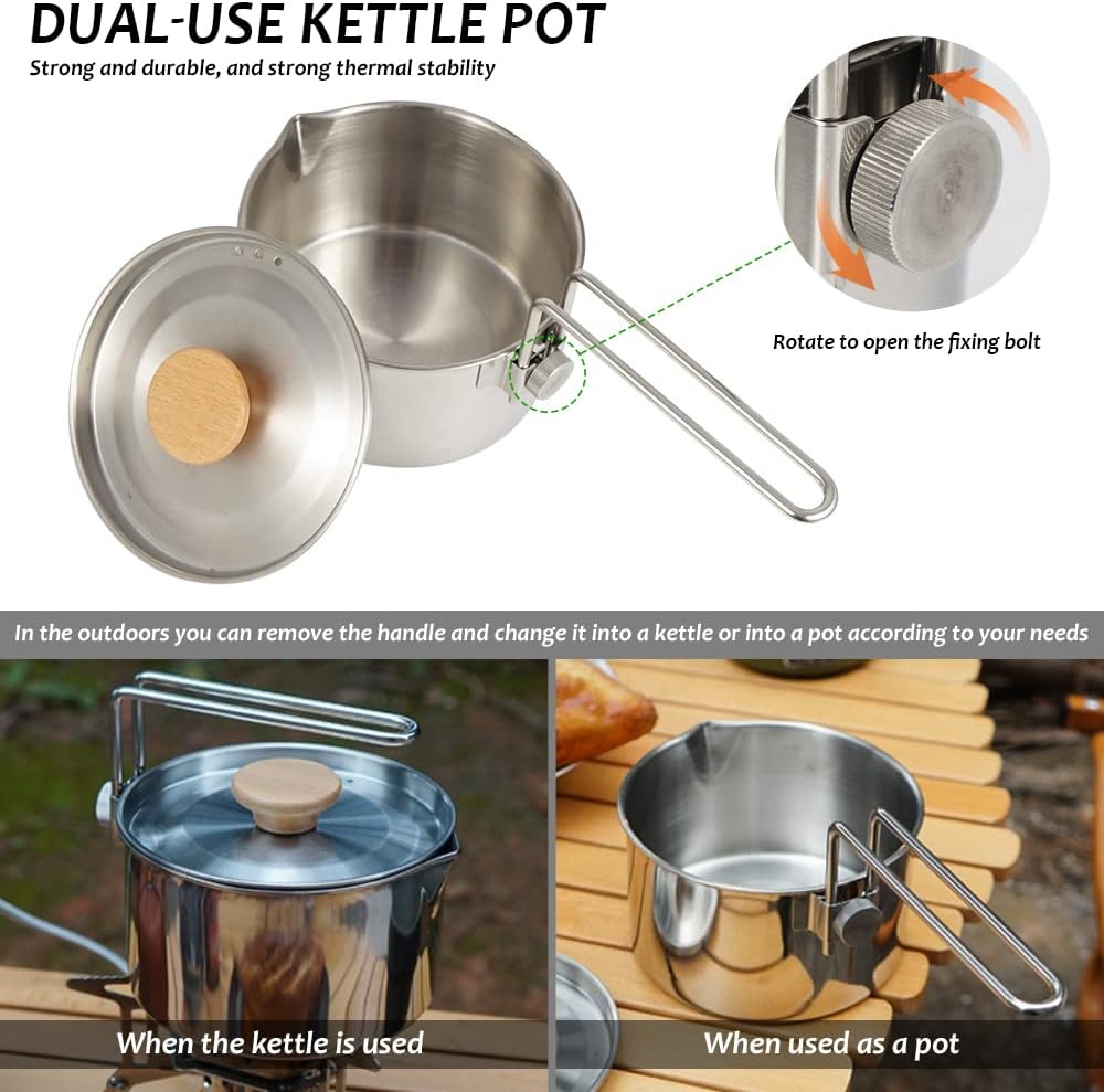 【Removable Handles for Space Saving】 The handle on the camping tea kettle is bent and removable to save space and to make the pot easy to hold. Rotate the round knob to install or remove the handle