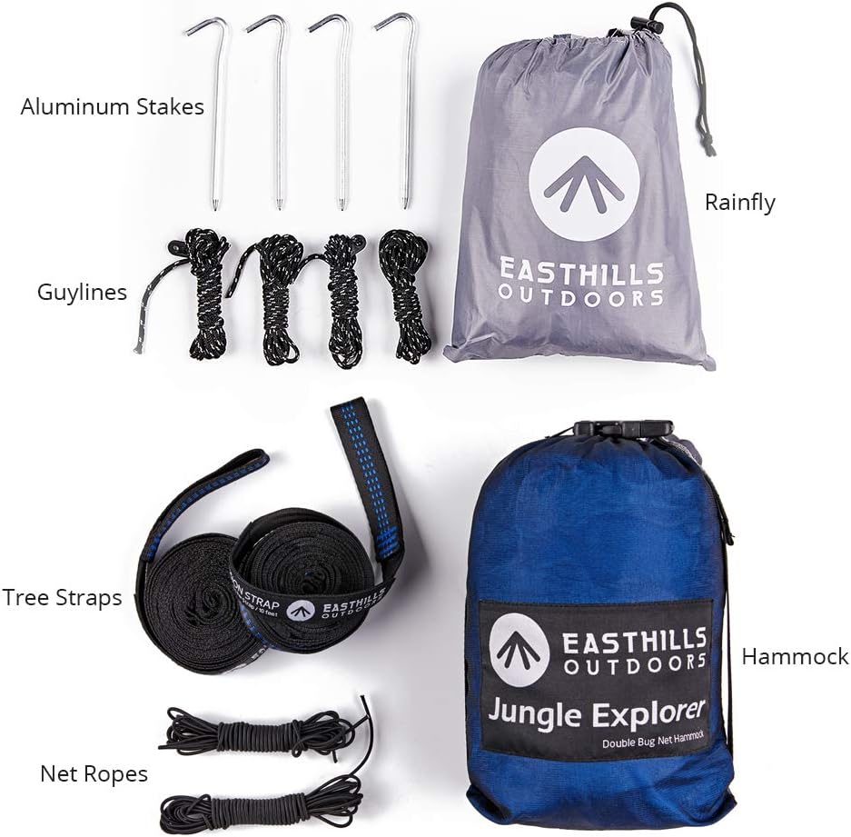 EVERYTHING INCLUDED: No need to look elsewhere! We include 2 long tree straps with 16 adjustable loops(750 lb. per straps/10 feet), 2 aluminum wiregate carabiners, 2 net ropes and a hammock with bug net. In addition, we also include 4 guylines, 4 aluminum stakes and a waterproof rainfly.